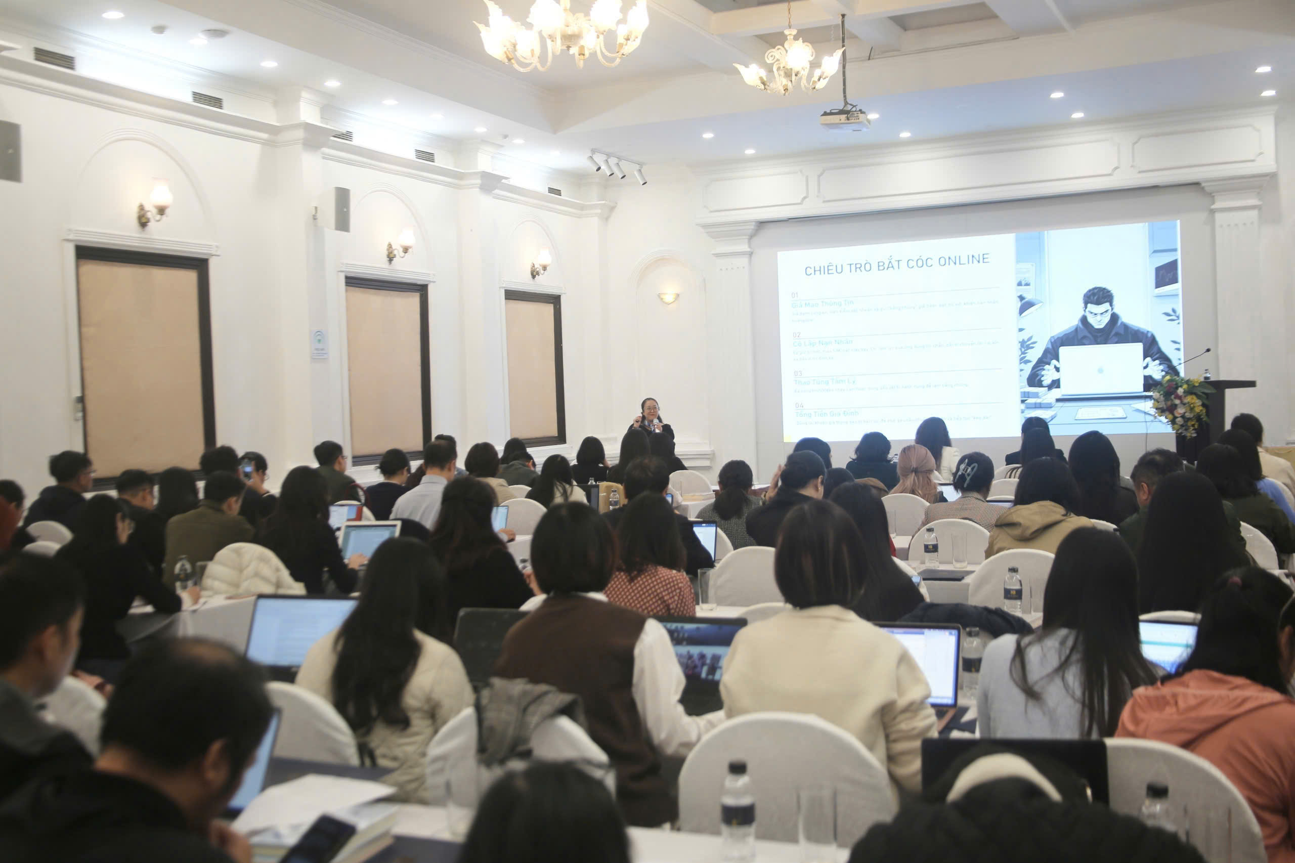 Bà Lê Thị Mai Quyên cho biết các vụ bắt cóc, lừa đảo trực tuyến thường tuân theo một chuỗi hành vi như giả mạo thông tin - cô lập nạn nhân - thao túng tâm lý - tống tiền.