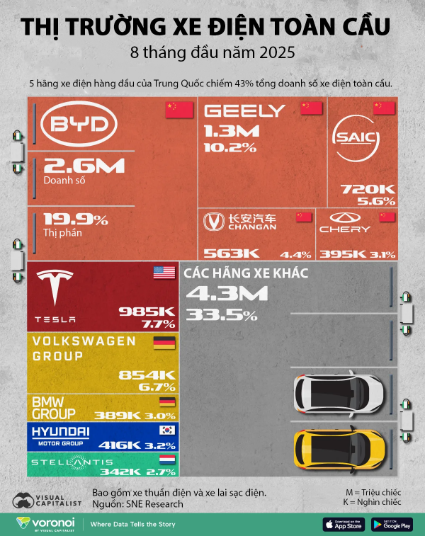 Tính trong năm 2025, 5 hãng xe điện hàng đầu của Trung Quốc chiếm khoảng 43% thị trường toàn cầu nhờ kết hợp doanh số trong nước và quốc tế.
