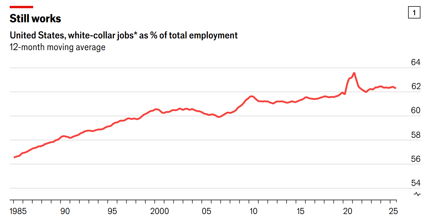 Cho đến nay, viễn cảnh về một “cuộc khủng hoảng việc làm” do AI gây ra vẫn còn xa vời. Trong năm qua, tỷ lệ các công việc văn phòng - nhóm được cho là chịu ảnh hưởng nhiều nhất từ tự động hóa của AI, vẫn duy trì ổn định trong tổng số việc làm (xem biểu đồ 1).