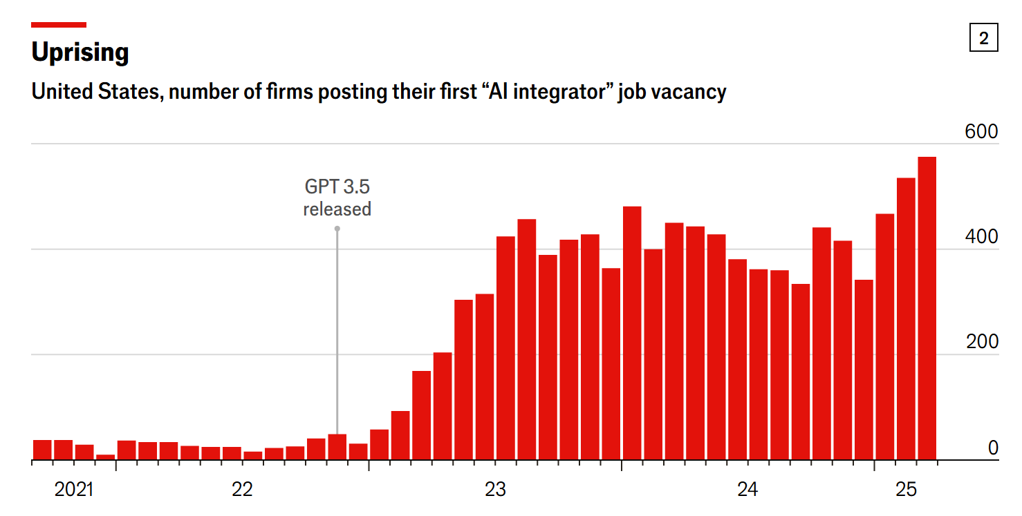 Gia tăng số lượng công ty tại Mỹ lần đầu đăng tuyển vị trí "người tích hợp AI". Nguồn: “Trí tuệ nhân tạo tạo ra sự thay đổi công nghệ dựa trên thâm niên”, S.M. Hosseini & G. Lichtinger, SSRN, 2025.
