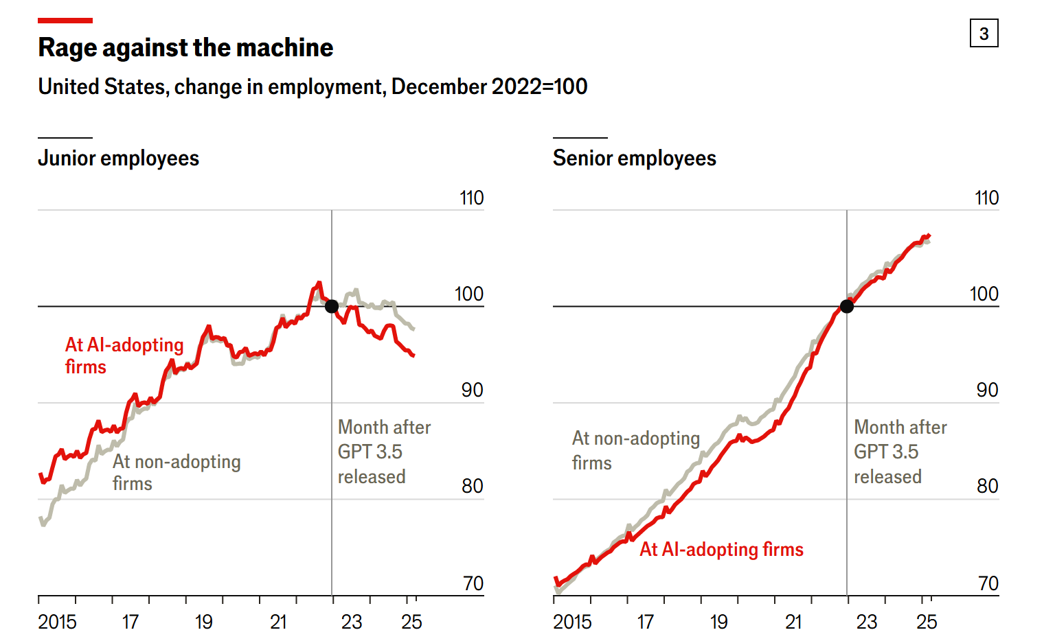 Nếu AI không có tác động đến việc làm, hoạt động tuyển dụng ở hai nhóm công ty này phải tương đồng. Thế nhưng, các nhà nghiên cứu đã phát hiện ra điều ngược lại: Mặc dù các vị trí cấp thấp đều giảm trên diện rộng sau năm 2023, mức sụt giảm trong sáu quý tiếp theo tại các công ty áp dụng AI lại sâu hơn 7,7% (xem biểu đồ 3).