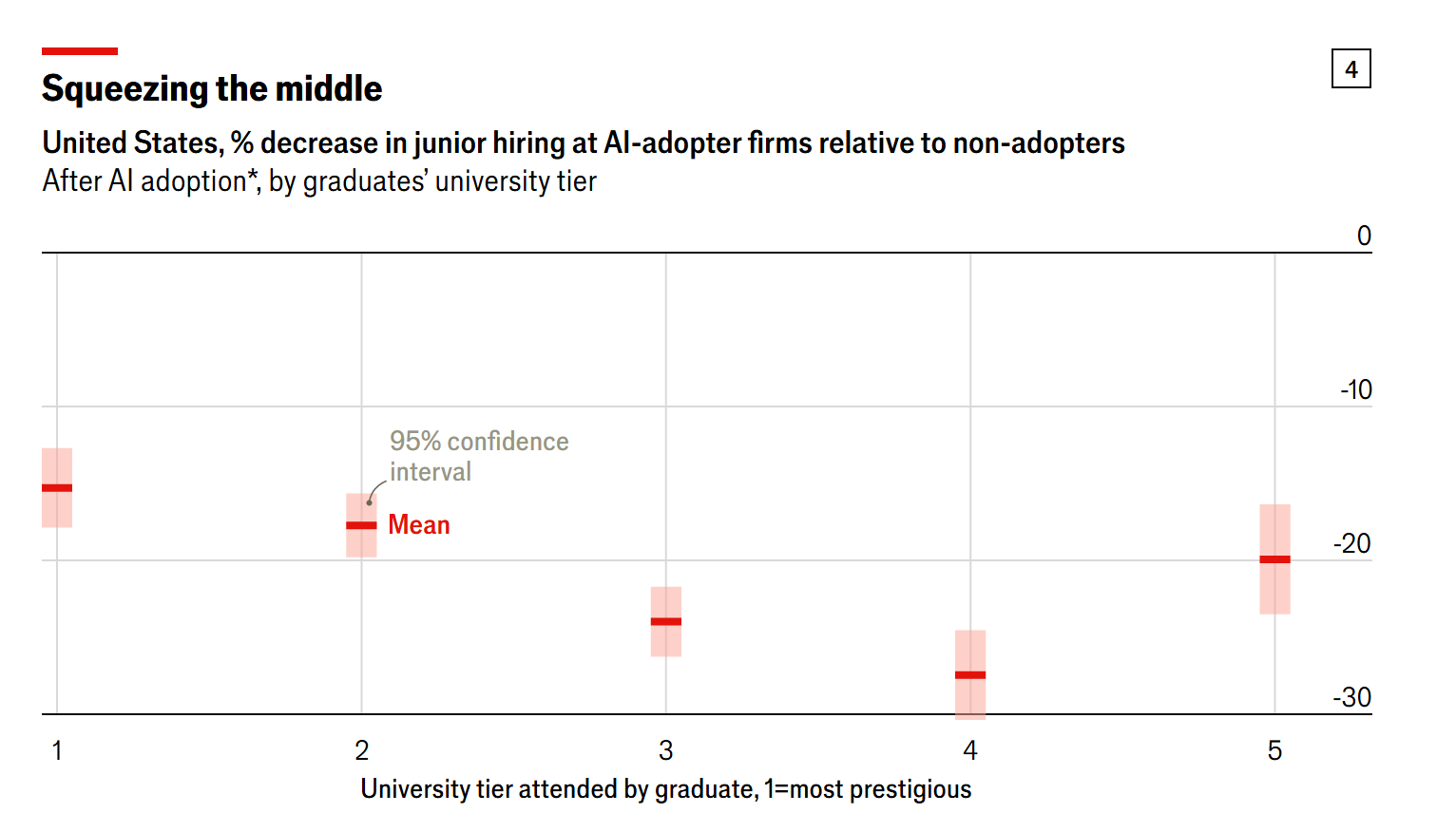Các tác giả phỏng đoán rằng, các doanh nghiệp có xu hướng giữ lại nhân sự từ các trường top đầu vì kỹ năng chuyên môn cao và giữ lại nhân sự từ các trường cuối bảng vì chi phí thấp hơn. Điều này cho thấy, nhóm ở giữa có thể phải đối mặt với mối đe dọa lớn nhất từ AI.
