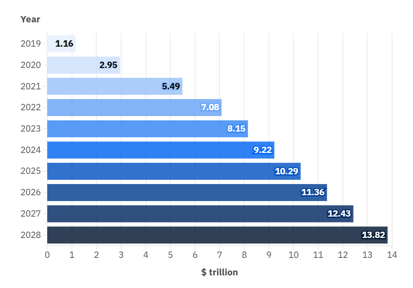 Chi phí ước tính hàng năm của tội phạm mạng trên toàn thế giới, đơn vị: nghìn tỷ. Nguồn: Statista.