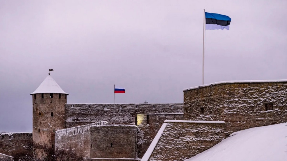 Một lá cờ Estonia tung bay trước lá cờ Nga bay trên Pháo đài Ivangorod của Nga ở bờ bên kia sông Narva tại Narva. Ảnh: Getty.