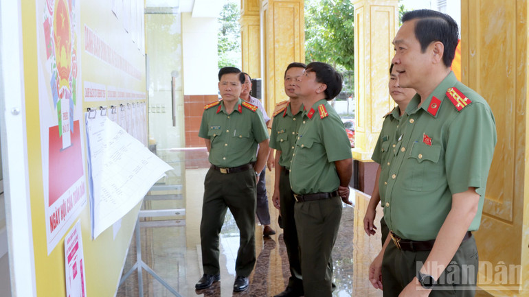 Đại tá Hồ Việt Triều, Giám đốc Công an tỉnh Cà Mau (bên phải) kiểm tra nơi niêm yết danh sách người ứng cử đại biểu Quốc hội khóa XVI và đại biểu Hội đồng nhân dân tỉnh nhiệm kỳ 2026-2031.