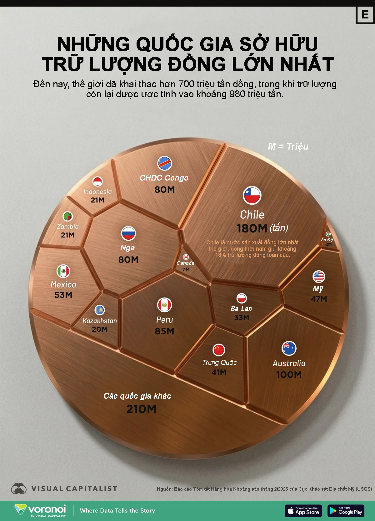Dựa trên dữ liệu từ Cục Khảo sát Địa chất Mỹ (USGS) năm 2026, đồ họa thông tin dưới đây gồm các quốc gia sở hữu trữ lượng kim loại đồng lớn nhất thế giới.