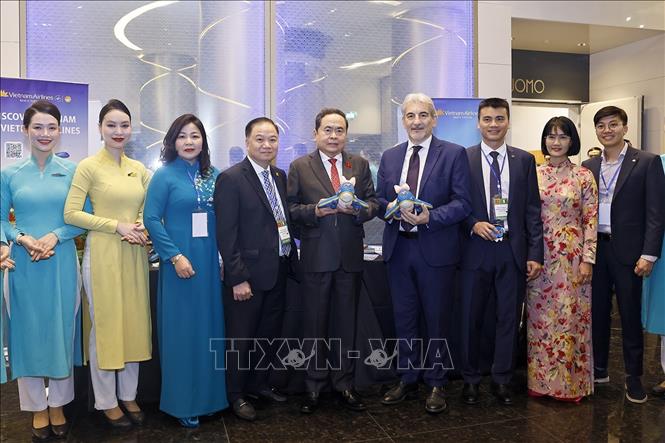Chủ tịch Quốc hội Trần Thanh Mẫn và đại biểu tham quan gian hàng của Vietnam Airlines - Ảnh: TTXVN