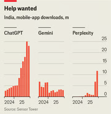 Lượt tải các ứng dụng ChatGPT, Gemini và Perplexity tại Ấn Độ. (Nguồn: The Economist).