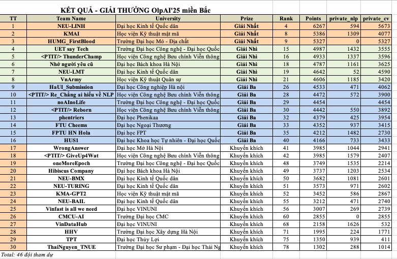 Kết quả Vòng khu vực OlpAI’25 miền Bắc.