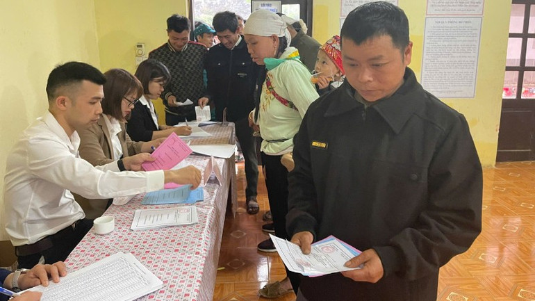 Cử tri nhận phiếu bầu tại khu vực bỏ phiếu thôn Bản Mạn, đơn vị bầu cử số 4, xã Bằng Thành. Ảnh: Tuấn Sơn.