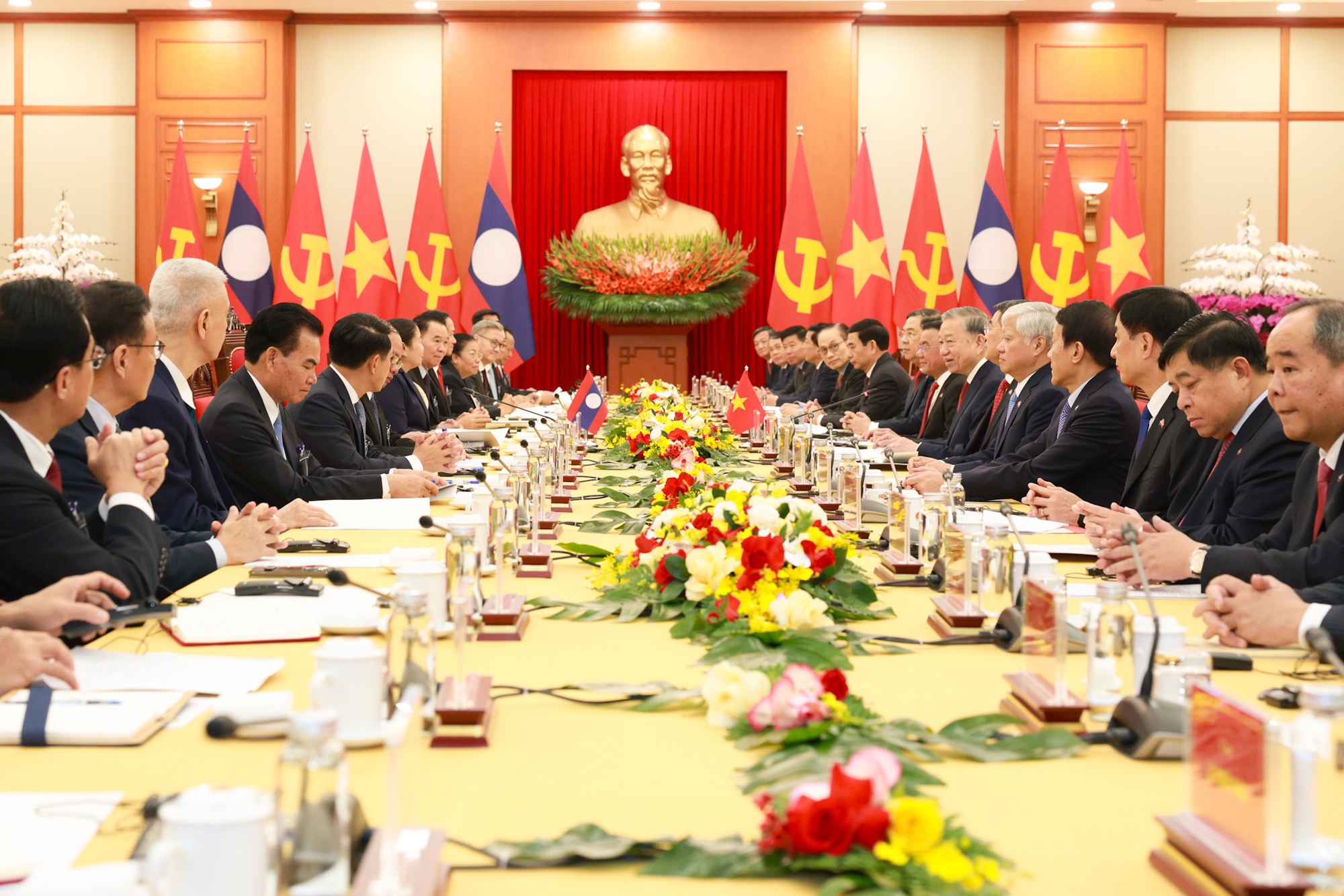 Trong bầu không khí phấn khởi, hòa cùng với niềm vui chung của nhân dân hai nước trước thành công rất tốt đẹp của Đại hội lần thứ XIV của Đảng Cộng sản Việt Nam và Đại hội lần thứ XII của Đảng Nhân dân Cách mạng Lào vừa qua, Tổng Bí thư Tô Lâm và Tổng Bí thư, Chủ tịch nước Lào Thongloun Sisoulith đã thông báo cho nhau về tình hình mỗi Đảng, mỗi nước và những kết quả nổi bật của Đại hội đại biểu toàn quốc mỗi Đảng.