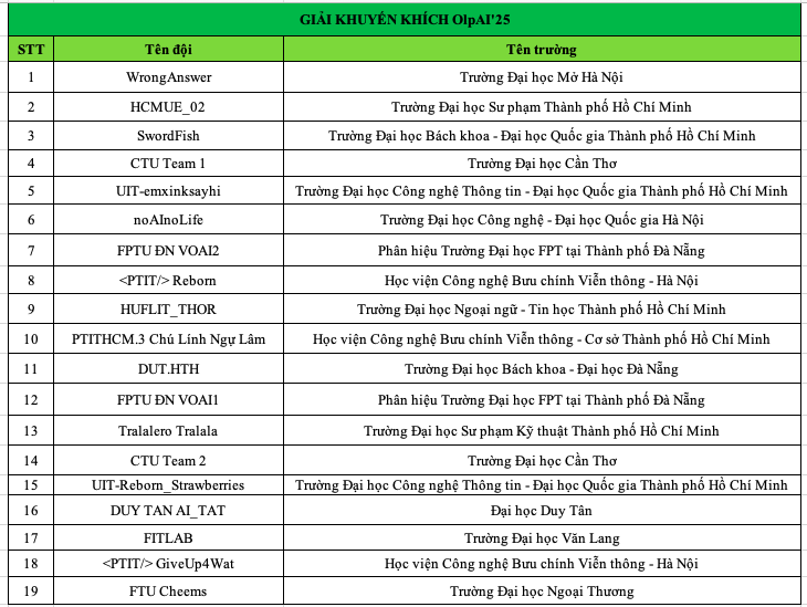 Ở Giải Khuyến khích, BTC đã vinh danh 19 đội tuyển đến từ nhiều trường đại học trên cả nước. Đây đều là những đội đã thể hiện tinh thần quyết tâm, khả năng tư duy và bản lĩnh vượt khó trong suốt hành trình OlpAI’25. Sự góp mặt của các đội tuyển đến từ đa dạng vùng miền cho thấy sức lan tỏa mạnh mẽ của phong trào AI tại các trường đại học, học viện trên cả nước.