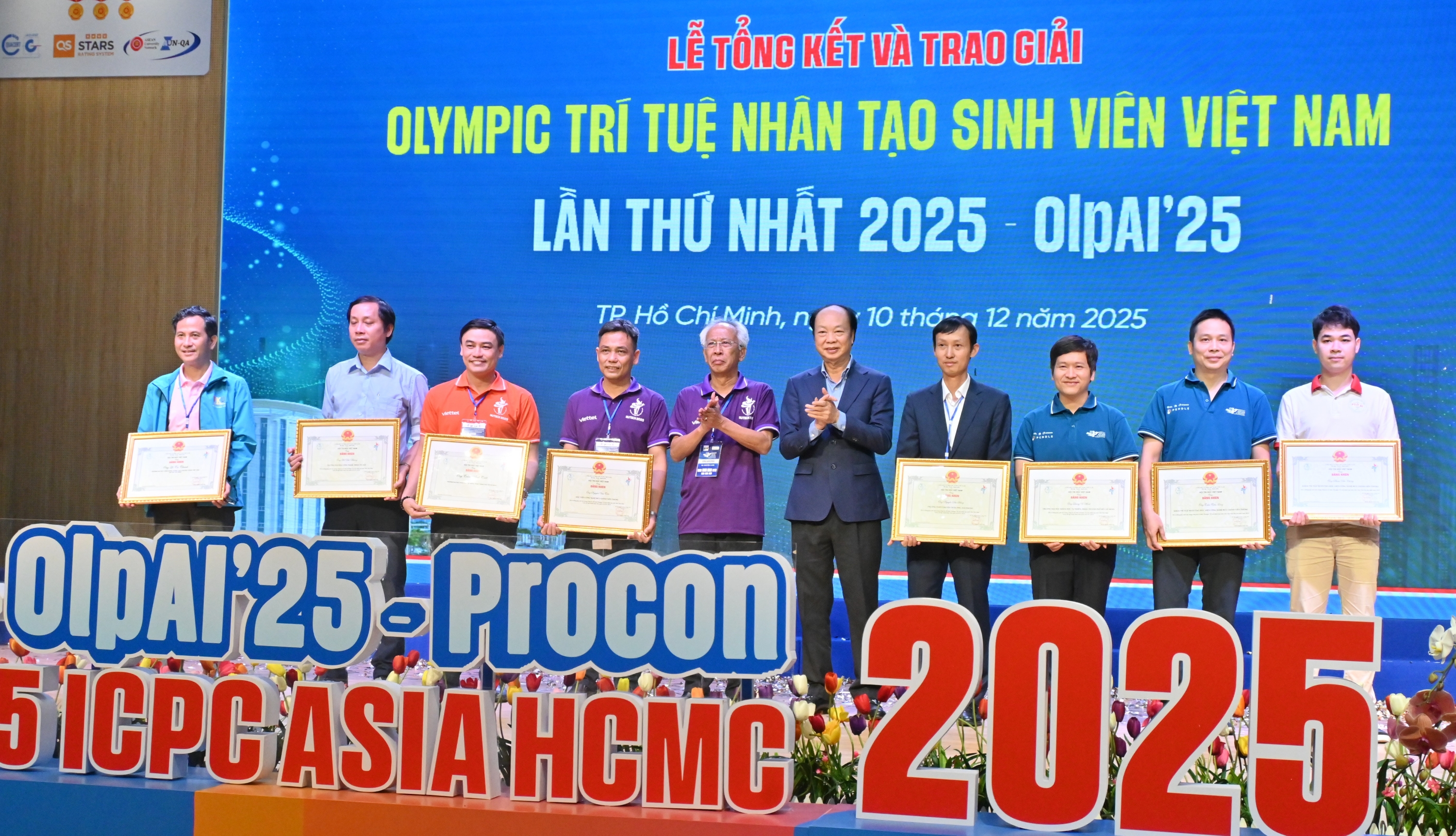 Ông Nguyễn Long, Trưởng BTC OLP-ICPC, Chủ tịch ICPC Việt Nam, Đồng Giám đốc ICPC Châu Á - Thái Bình Dương, Phó Chủ tịch kiêm Tổng thư ký Hội Tin học Việt Nam (VAIP) trao tặng bằng khen của VAIP cho các thầy cô, chuyên gia có thành tích và công sức đóng góp cho thành công của Olympic Trí tuệ nhân tạo Sinh viên Việt Nam năm 2025.