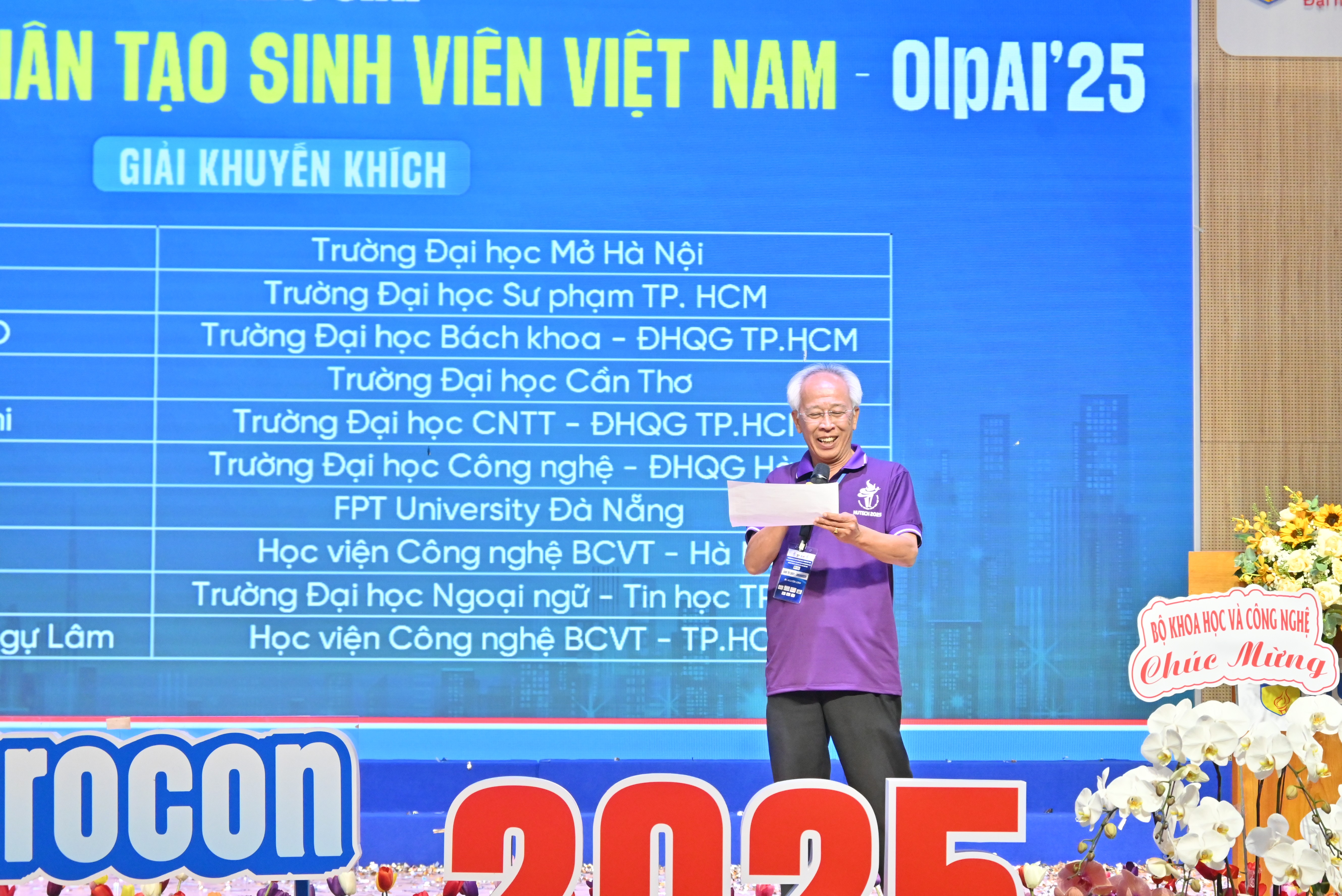 Phát biểu tổng kết, PGS.TS. Đỗ Phan Thuận, Chủ tịch HĐGK OlpAI, cho biết vòng chung kết đã khép lại trong thành công, để lại dư âm mạnh mẽ. “Chỉ đến khi đồng hồ đếm ngược trở về số 0, chúng tôi mới thực sự có thể nở nụ cười vì kỳ thi đã diễn ra tốt đẹp”- thầy chia sẻ.