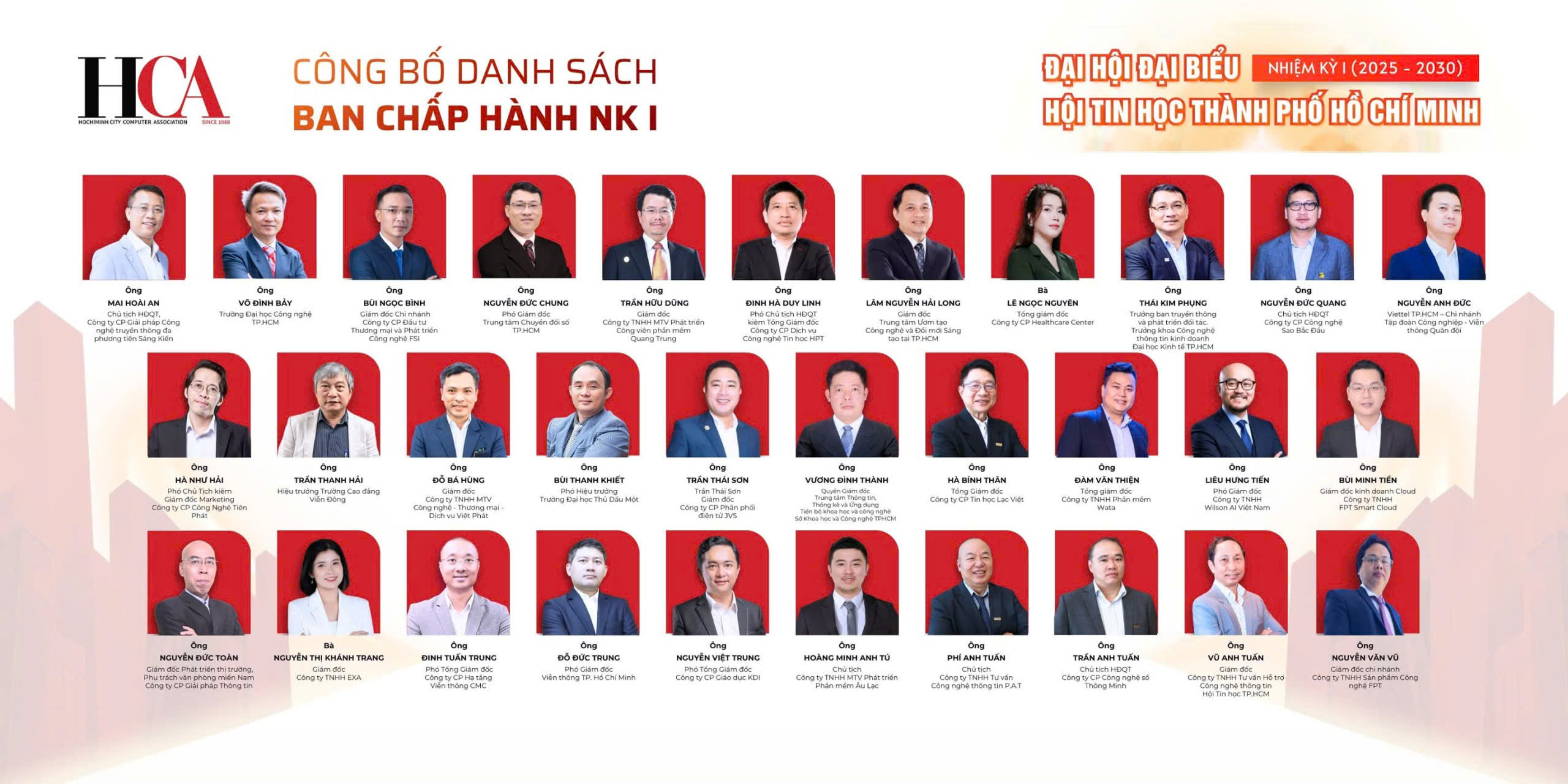 Sau hơn 03 tiếng làm việc nghiêm túc, trách nhiệm, Đại hội đại biểu Hội Tin học TP.HCM nhiệm kỳ I (2025 – 2030) đã thông qua các văn kiện quan trọng và thống nhất bầu ra Ban Chấp hành HCA nhiệm kỳ I (2025 – 2030) gồm 31 ủy viên đại diện cho hơn 500 hội viên, có đủ phẩm chất, trình độ theo tiêu chí để thực hiện nhiệm vụ quan trọng mà Đại hội giao phó. Trong đó có 09 uỷ viên Ban Thường vụ. Ngoài ra, Đại hội còn bầu ra Ban Kiểm tra gồm 03 uỷ viên.