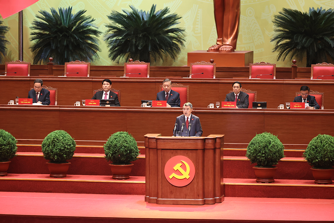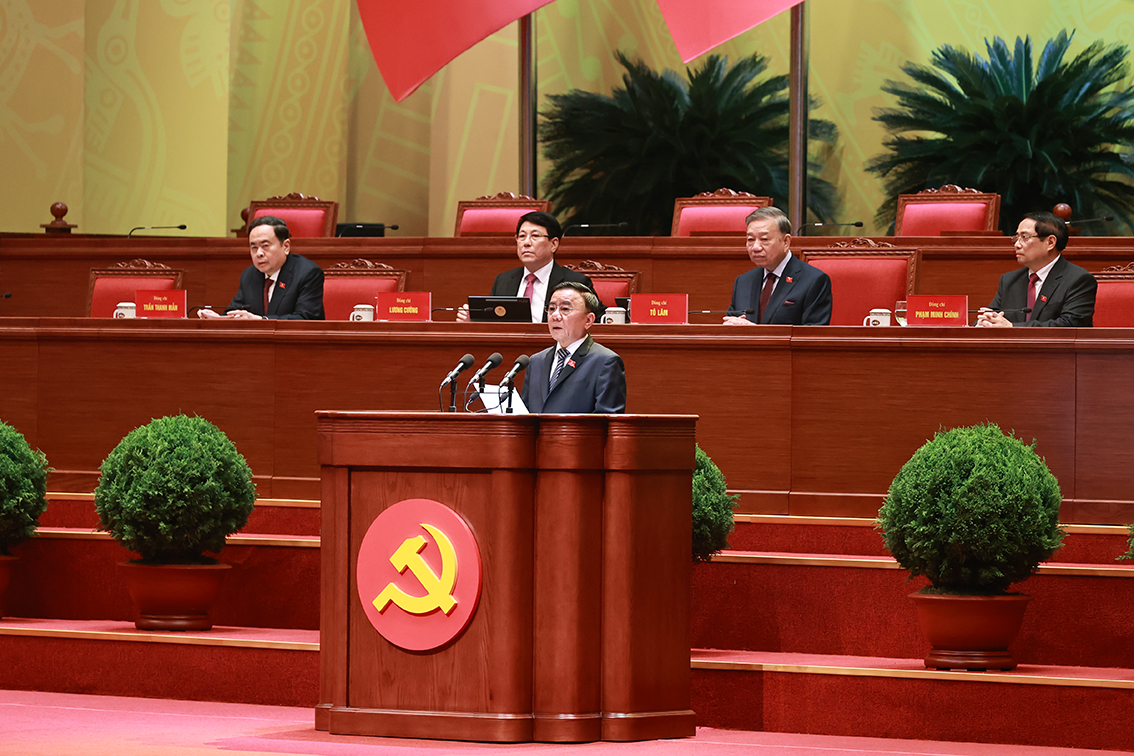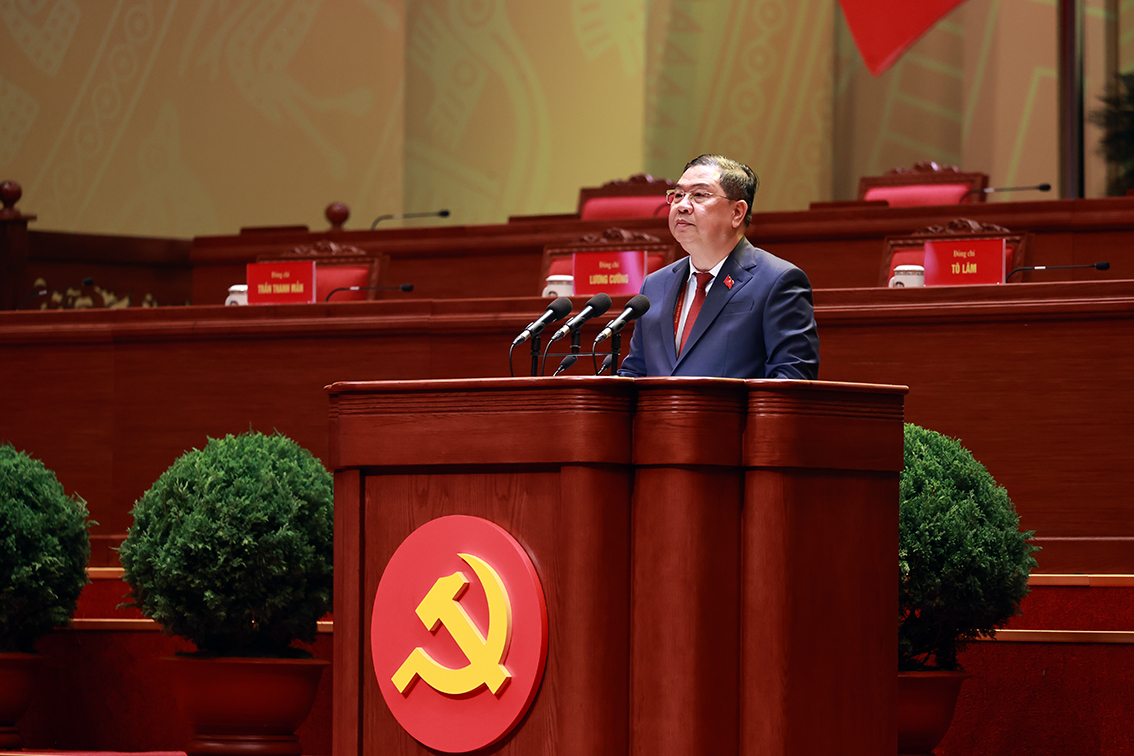 Đồng chí Lê Minh Hưng, Ủy viên Bộ Chính trị, Bí thư Trung ương Đảng, Trưởng Ban Tổ chức Trung ương báo cáo tiếp thu ý kiến các đoàn đại biểu góp ý vào quy chế làm việc của Đại hội và toàn văn dự thảo Quy chế làm việc đã tiếp thu ý kiến các đoàn đại biểu - Ảnh: VGP/Nhật Bắc