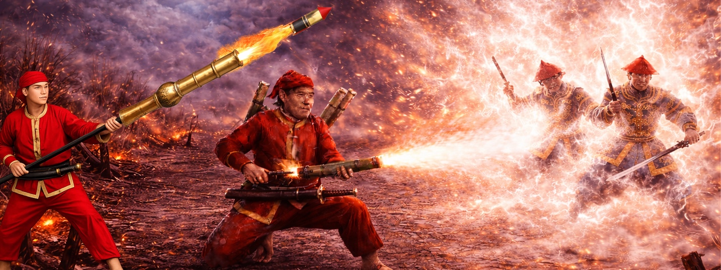 Quân Đại Việt giáp chiến quân Thanh bên bờ sông Hồng, hàng đầu là ống phóng hỏa hổ bằng tre phun lửa Phốt pho xa 10m lập tức biến giặc thành bó đuốc sống, hàng sau là pháo thăng thiên Phốt pho phóng loạt biến toàn bộ đại quân của giặc thành biển lửa.