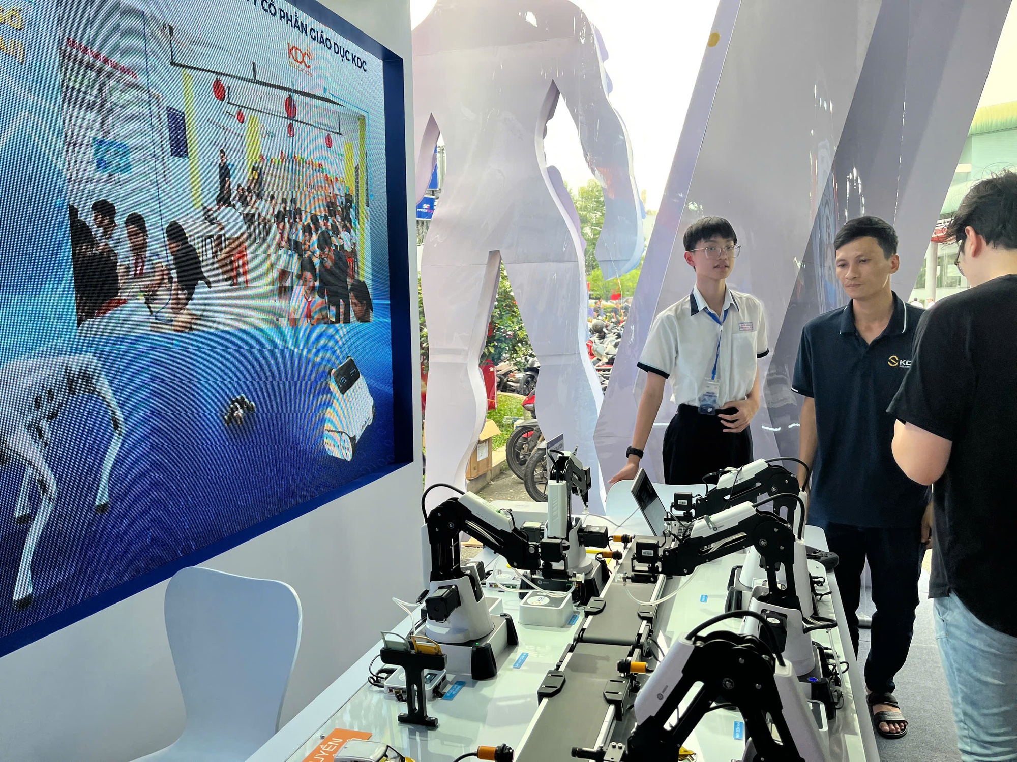 Nhóm ngân hàng số, blockchain, giáo dục STEM được đại diện bởi HDBank và Công ty giáo dục KDI, mang đến các mô hình giáo dục và robot STEM hiện đại, truyền cảm hứng sáng tạo cho thế hệ trẻ và cộng đồng doanh nghiệp. Đặc biệt, gian hàng CT Group trình diễn drone không người lái hiện đại, trong khi kỳ lân fintech MoMo giới thiệu các giải pháp tài chính công nghệ tiên tiến, tạo điểm nhấn nổi bật cho triển lãm.