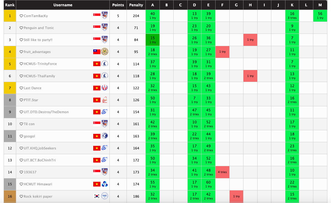 Sau khoảng 1 tiếng thi đấu, bảng xếp hạng tiếp tục có những biến động đáng chú ý. Đội ComTamBacKy của Đại học Quốc gia Singapore (NUS) đang tạm dẫn đầu với 5 bài. Xếp ngay sau là 2 đội cũng đến từ NUS với 4 bài.