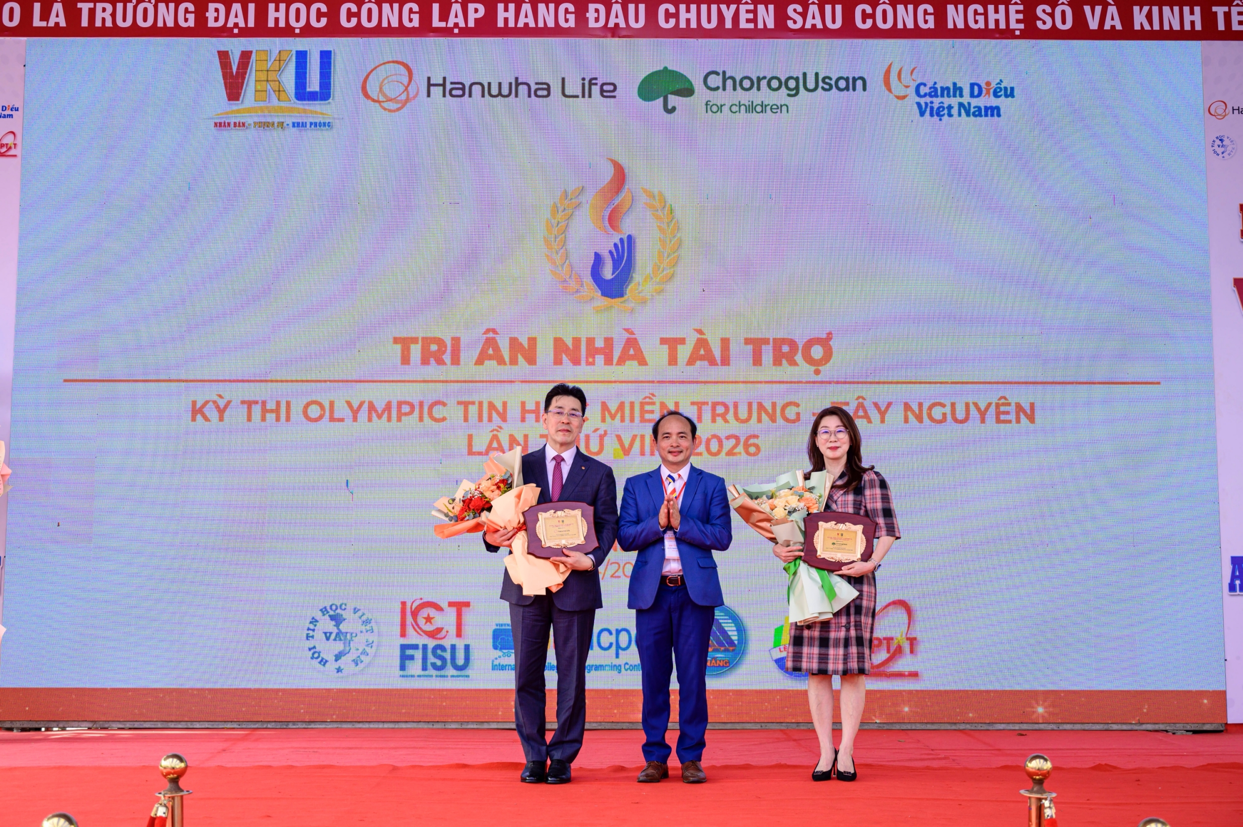 Ban Tổ chức trao tặng biểu trưng, tặng hoa cảm ơn Hanwha Life và Quỹ ChorogUsan for Children, Hàn Quốc đã đồng hành cùng Kỳ thi năm nay. Ảnh VKU