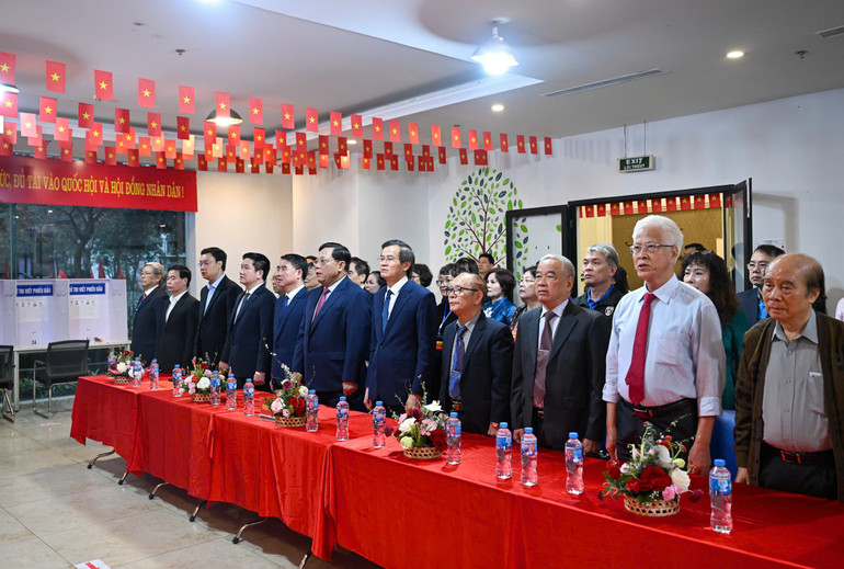 Các cử tri thực hiện nghi thức chào cờ tại Khu vực bỏ phiếu số 4, phường Thanh Xuân (Hà Nội).