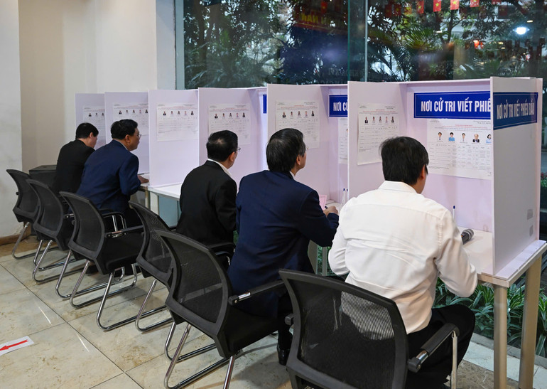 Cử tri bỏ phiếu tại Khu vực bỏ phiếu số 4, phường Thanh Xuân (Hà Nội). Ảnh: Duy Linh