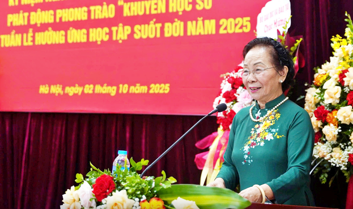 GS.TS Nguyễn Thị Doan tại lễ phát động phong trào thi đua "Khuyến học số" trong toàn hệ thống Hội để tiếp tục đẩy mạnh phong trào "Bình dân học vụ số". Ảnh: Văn Thành.