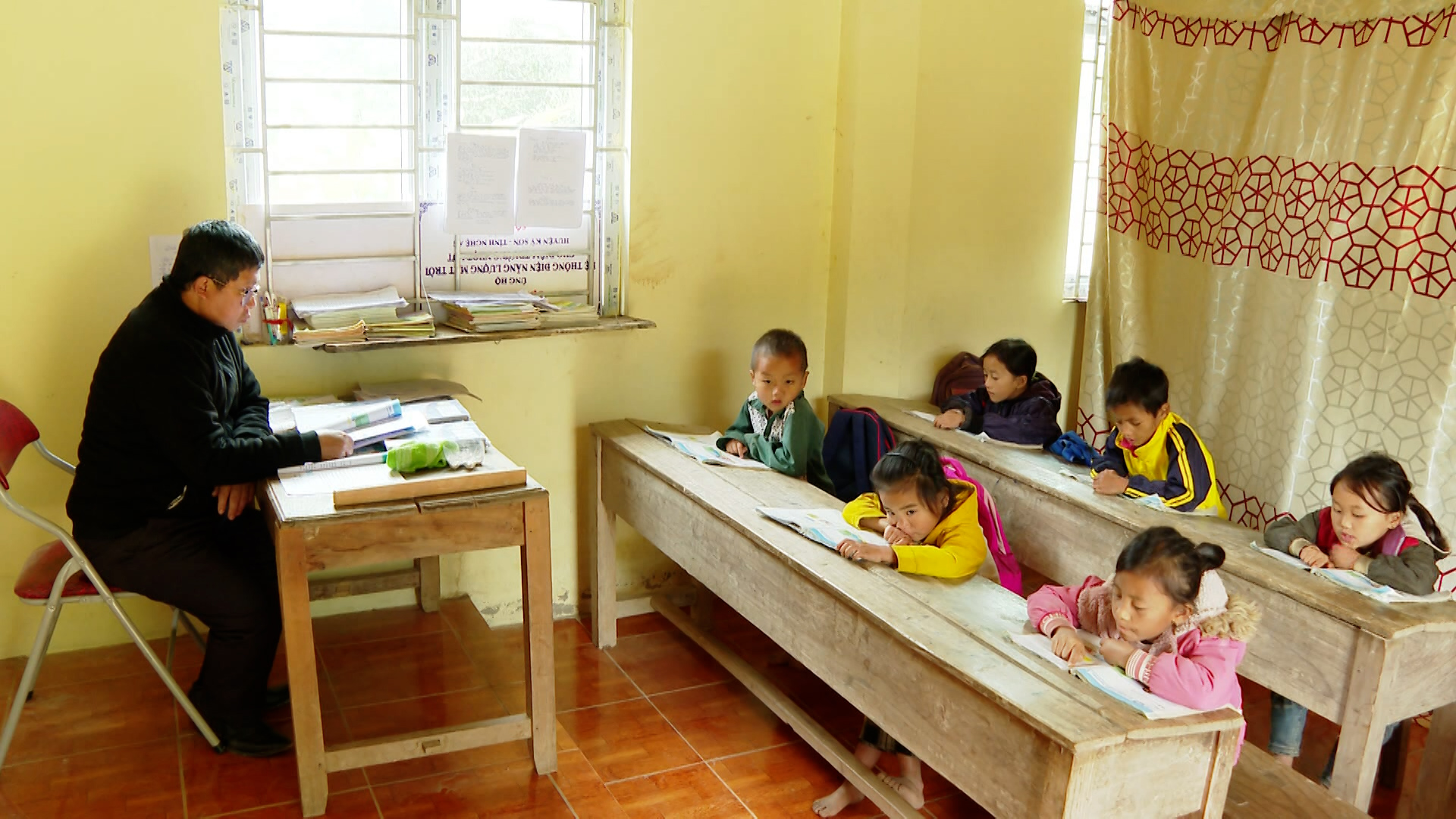 Những ngày cận Tết, khi nhiều bản làng vùng cao Nghệ An đã bắt đầu thưa dần nhịp sinh hoạt cuối năm, tiếng trẻ đọc bài vẫn vang lên giữa núi rừng. Không gian yên ắng của bản làng được đánh thức bởi những giọng đọc còn non nớt. Trong căn phòng ghép bằng ván, những đứa trẻ trong độ tuổi mầm non đang ngồi ngay ngắn, đồng thanh cất tiếng: "...đôi bàn tay. Em rửa chân, sạch tay, cô là mẹ", giọng các em hòa cùng lời của cô giáo. Một buổi học mới lại bắt đầu.