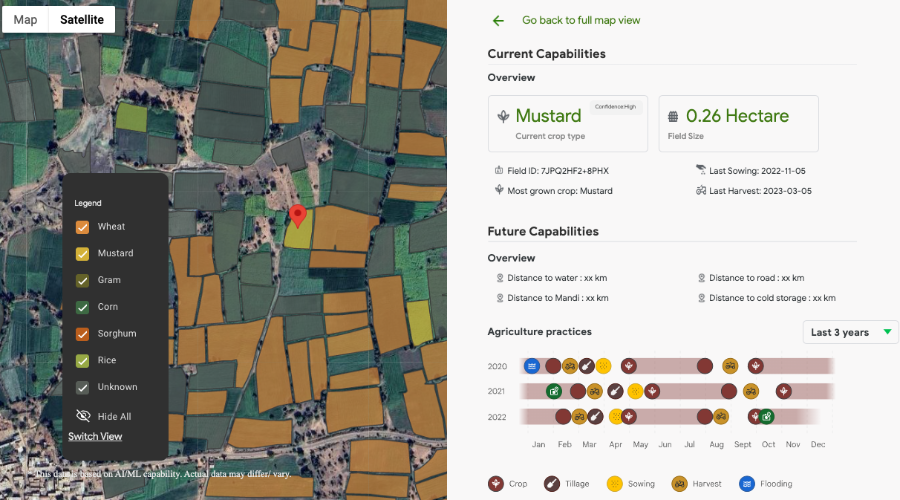Giao diện dữ liệu của AMED API_ Bản đồ vệ tinh thể hiện các loại cây trồng khác nhau được nhận diện tự động bằng AI. Ảnh: Google