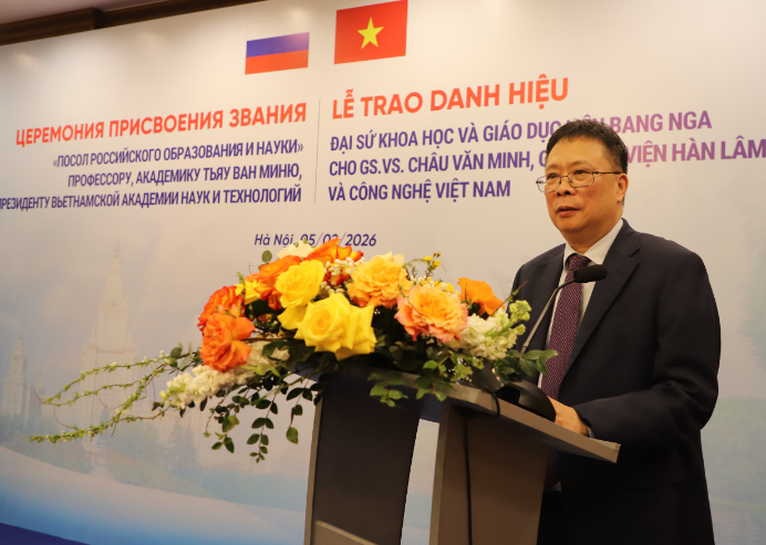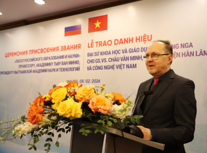 Ngày 5/2/2026, tại Hà Nội, Đại sứ quán Liên bang Nga tại Việt Nam phối hợp với Viện Hàn lâm Khoa học và Công nghệ (KH&CN) Việt Nam long trọng tổ chức Lễ trao tặng danh hiệu “Đại sứ Khoa học và Giáo dục Liên bang Nga” cho GS.VS. Châu Văn Minh, Viện sĩ Viện Hàn lâm Khoa học Nga, Chủ tịch Viện Hàn lâm KH&CN Việt Nam.