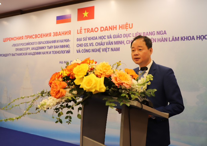 Thay mặt hơn 3.000 cán bộ, nhà khoa học của Viện Hàn lâm KH&CN Việt Nam, GS.TS. Trần Hồng Thái, Phó Chủ tịch Thường trực Viện Hàn lâm KH&CN Việt Nam trân trọng chúc mừng GS.VS. Châu Văn Minh và bày tỏ tin tưởng danh hiệu Đại sứ Khoa học và Giáo dục Liên bang Nga sẽ tiếp tục lan tỏa tinh thần kết nối, hợp tác nghiên cứu và đào tạo trong toàn Viện.