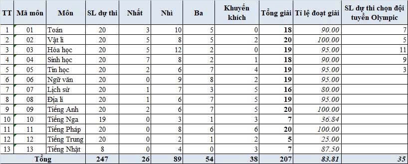 Cụ thể, trong tổng số 247 thí sinh tham dự, Hà Nội có 207 học sinh đoạt giải, đạt tỷ lệ 83,81%. Kết quả này gồm 26 giải Nhất, 89 giải Nhì, 54 giải Ba và 38 giải Khuyến khích. Đáng chú ý, Hà Nội là địa phương có số lượng giải Nhất và giải Nhì cao nhất toàn quốc, qua đó tiếp tục khẳng định chất lượng giáo dục mũi nhọn cũng như hiệu quả của công tác phát hiện, tuyển chọn và bồi dưỡng học sinh giỏi.
