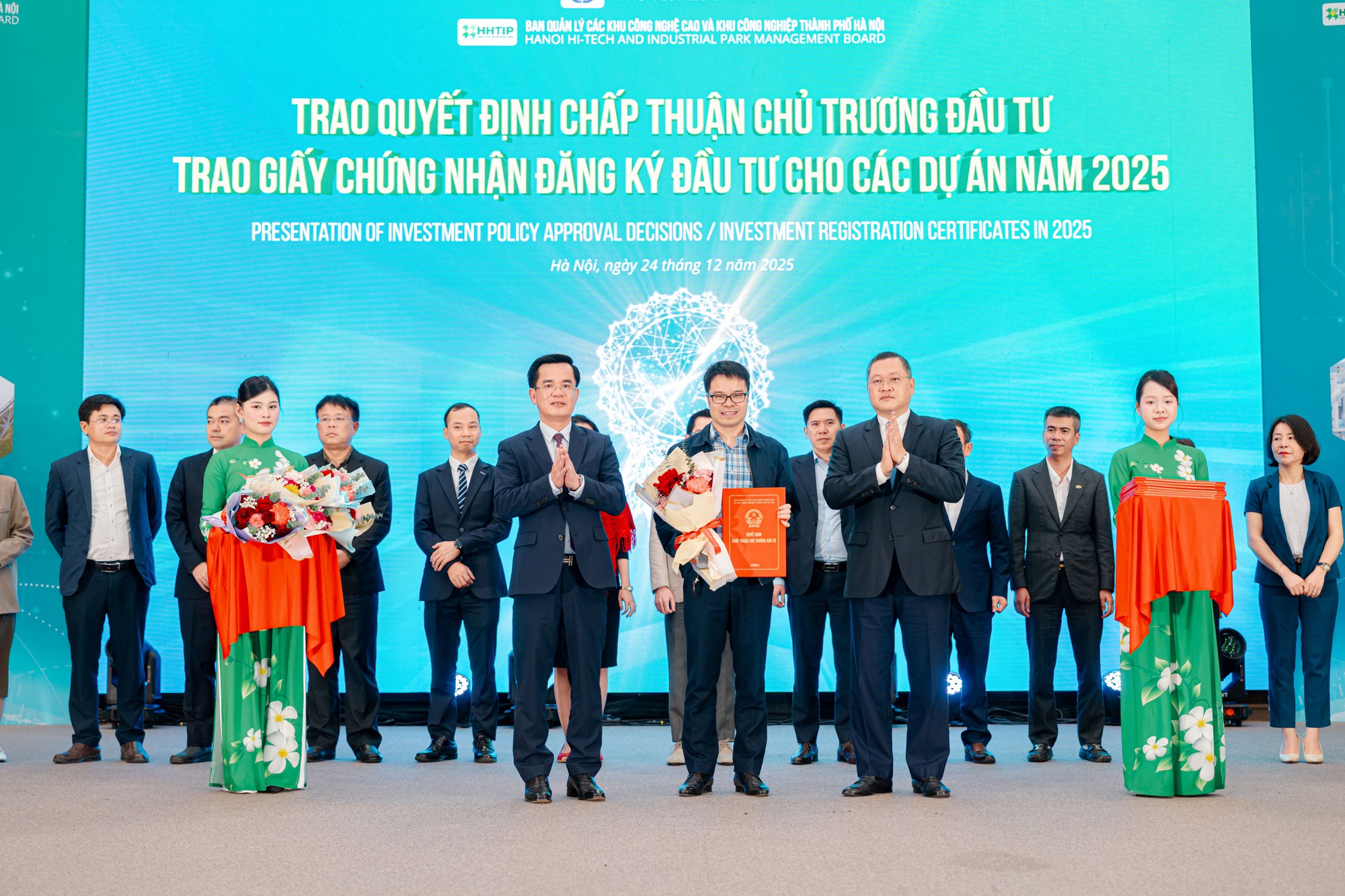 Ban Quản lý các Khu công nghệ cao và Khu công nghiệp TP. Hà Nội trao quyết định chấp thuận chủ trương đầu tư, trao giấy chứng nhận đăng ký đầu tư cho các dự án năm 2025. Ảnh: VGP/Cảnh Hoàng