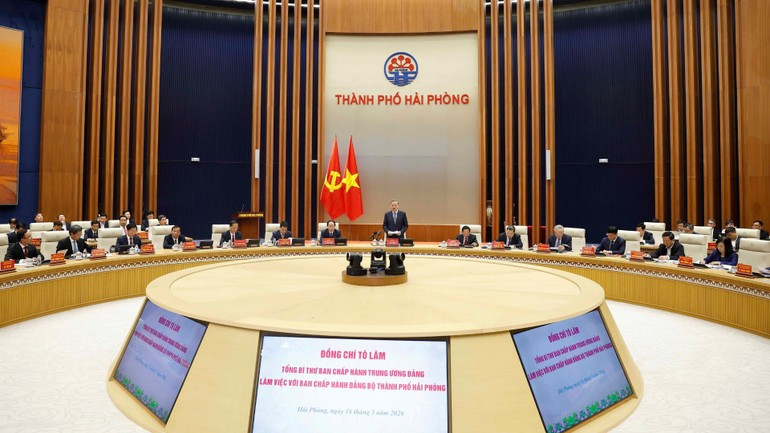 Phát biểu kết luận cuộc làm việc, Tổng Bí thư Tô Lâm nhấn mạnh, đây là dịp đặt Hải Phòng vào đúng vị trí chiến lược quốc gia, nhìn thẳng vào những vấn đề cốt lõi và xác định đúng vai trò, trách nhiệm của thành phố với sự phát triển của đất nước trong giai đoạn mới. Tổng Bí thư biểu dương thành phố những năm qua, nhất là năm 2025, đạt được nhiều kết quả đáng ghi nhận, thể hiện sự nỗ lực lớn của Đảng bộ, chính quyền, cộng đồng doanh nghiệp và nhân dân thành phố.