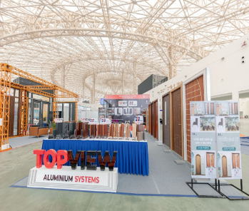 Gian hàng của TOP VIEW Aluminium Systems trưng bày hàng loạt mẫu cửa nhôm, vách kính và các giải pháp cửa ra vào hiện đại, sẵn sàng đón khách.