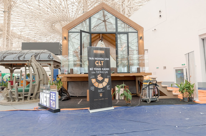 Một mô hình nhà mẫu ấn tượng, giới thiệu "Bê tông xanh CLT" và các giải pháp "Net Zero", thể hiện rõ xu hướng kiến trúc bền vững.