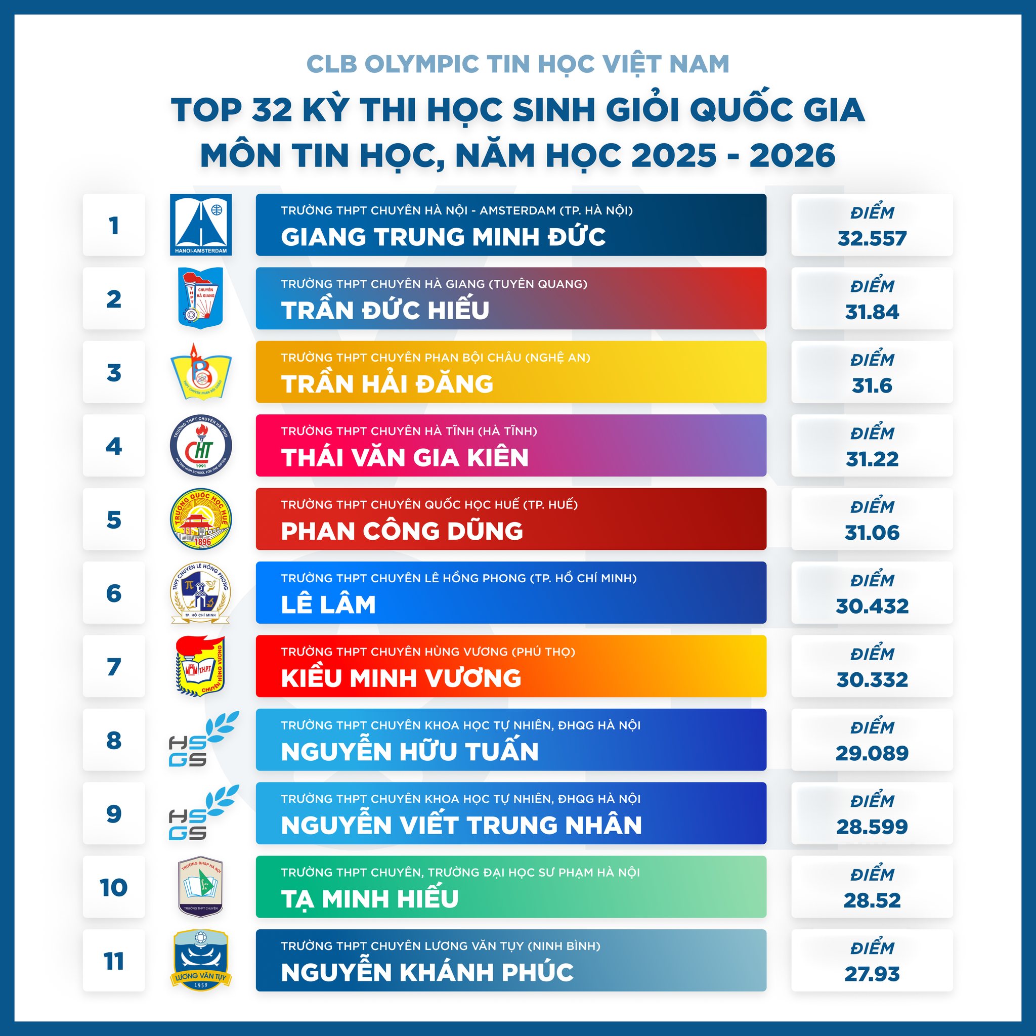 Danh sách Top 32 Kỳ thi học sinh giỏi quốc gia môn Tin học năm 2025 – 2026 cho thấy sự áp đảo của các trường THPT chuyên có truyền thống mạnh về Tin học. Trường THPT chuyên Hà Nội - Amsterdam có nhiều học sinh góp mặt ở nhóm đầu. Trường THPT chuyên Lê Hồng Phong (TP Hồ Chí Minh), Trường THPT chuyên Phan Bội Châu (Nghệ An), Trường THPT chuyên Khoa học Tự nhiên (ĐHQG Hà Nội), Trường THPT chuyên Quốc học Huế, Trường THPT chuyên Lê Quý Đôn (Đà Nẵng) tiếp tục là những cái tên quen thuộc.