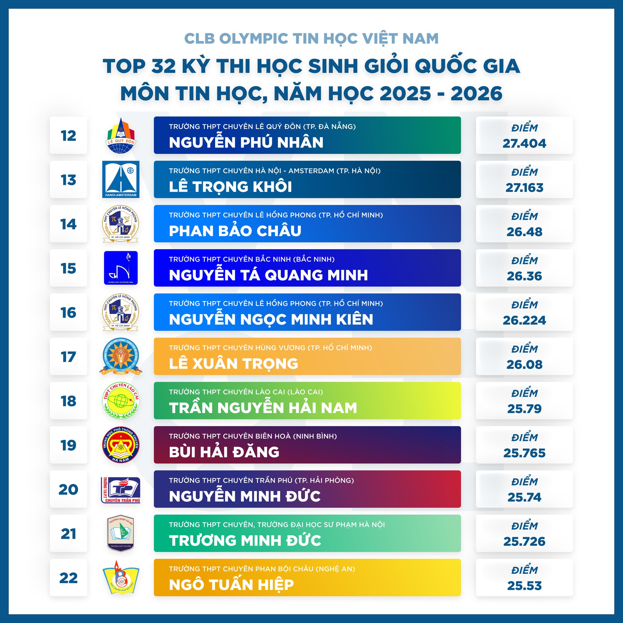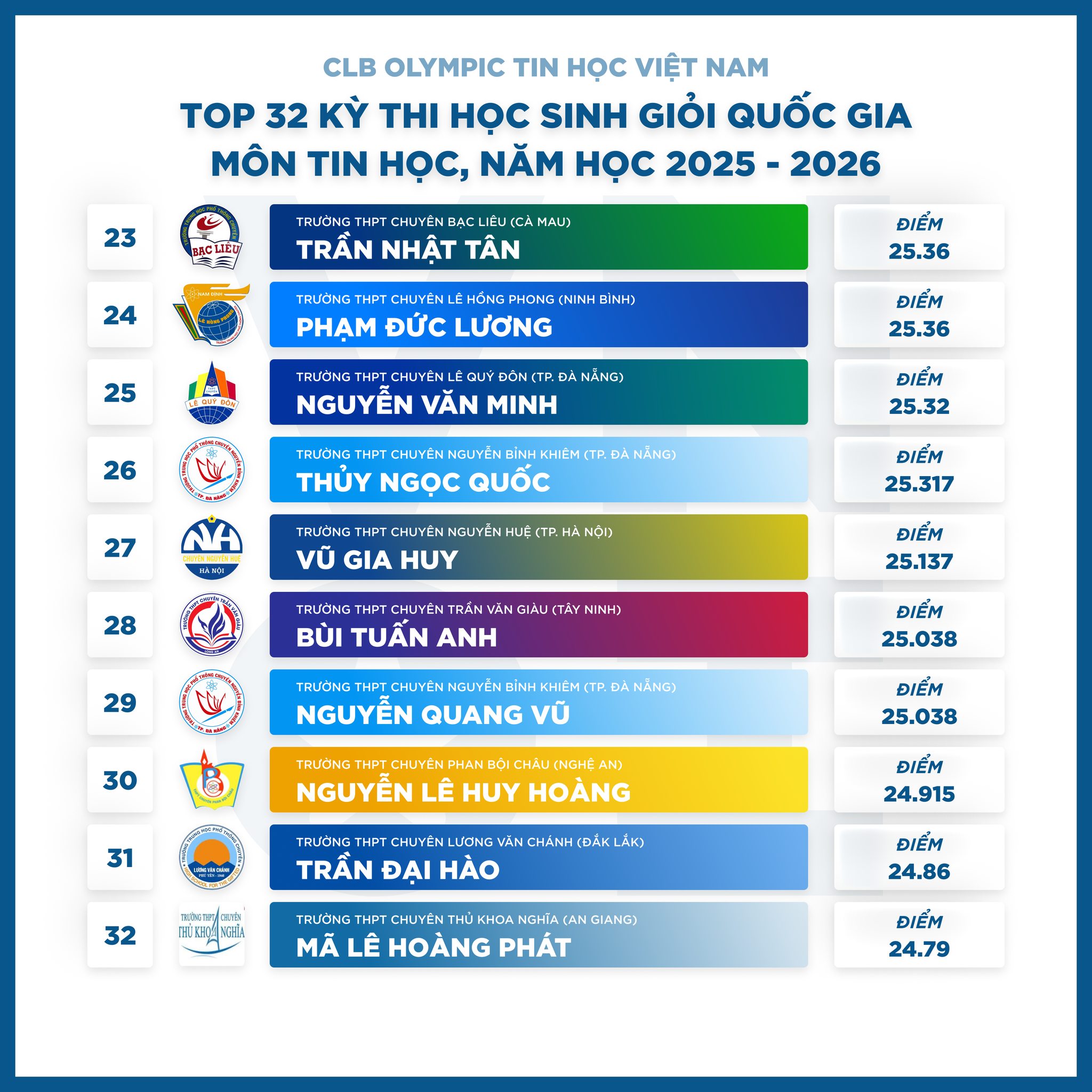 Bên cạnh đó, bảng xếp hạng năm nay ghi nhận sự hiện diện ngày càng rõ nét của nhiều địa phương ngoài các trung tâm lớn như Tuyên Quang, Phú Thọ, Lào Cai, Ninh Bình, Tây Ninh, Đắk Lắk, An Giang, Bạc Liêu. Nhiều học sinh đến từ các trường chuyên tỉnh đạt điểm số trên 25, tiệm cận nhóm đầu, cho thấy phong trào bồi dưỡng học sinh giỏi Tin học đang lan tỏa mạnh mẽ và được đầu tư bài bản tại các địa phương.