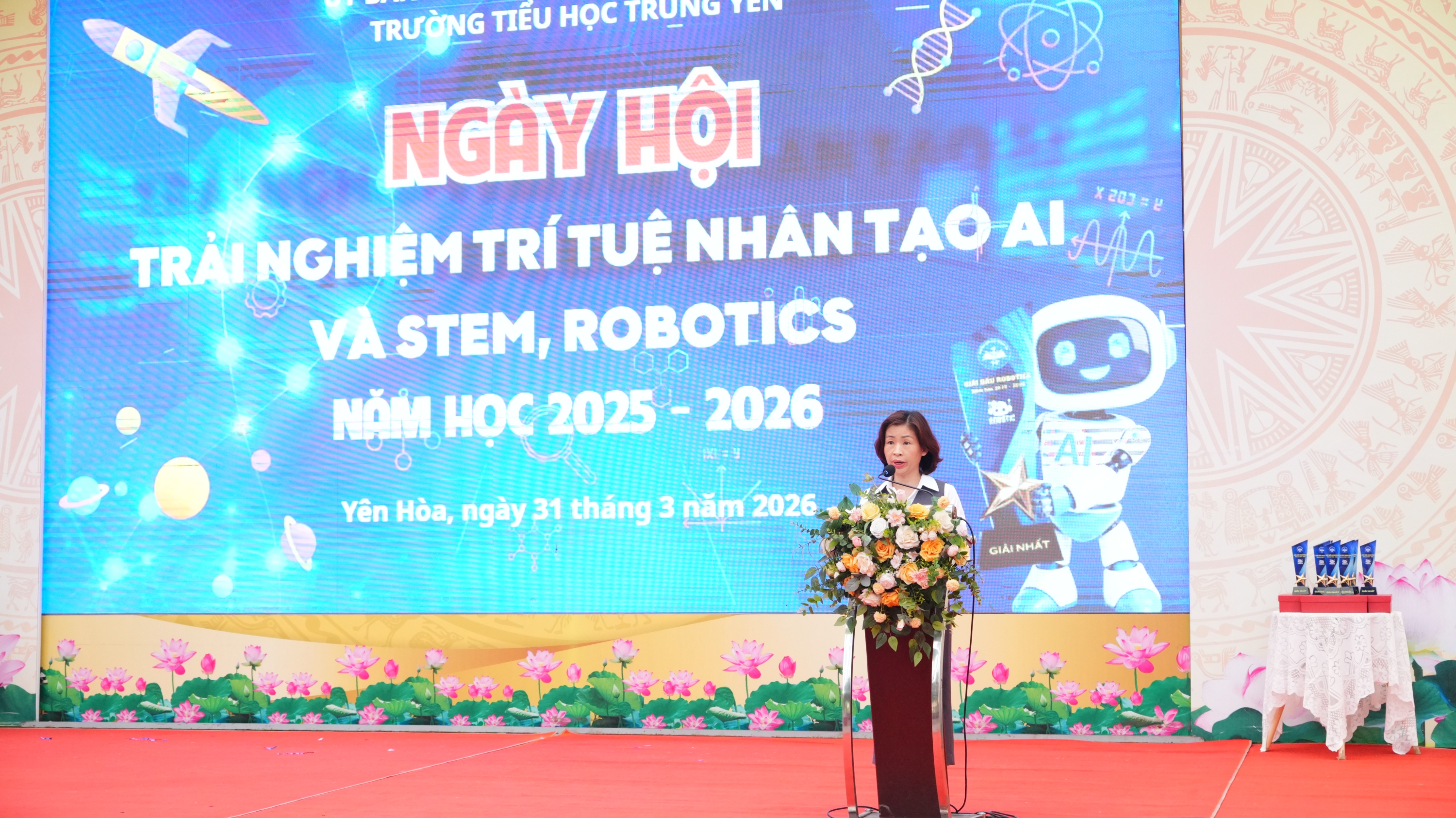 Phát biểu khai mạc, bà Đồng Thị Ngọc, Phó Hiệu trưởng Trường Tiểu học Trung Yên cho biết, trong bối cảnh chuyển đổi số mạnh mẽ, việc ứng dụng công nghệ, đặc biệt là trí tuệ nhân tạo vào giáo dục STEM đang trở thành xu hướng tất yếu của giáo dục hiện đại. Nhà trường đã chủ động triển khai nhiều giải pháp đồng bộ như đẩy mạnh chuyển đổi số trong quản trị và dạy học, tích hợp nội dung STEM, AI và Robotics vào chương trình giáo dục, phát triển các câu lạc bộ công nghệ, tổ chức các hoạt động trải nghiệm nhằm nâng cao năng lực số cho học sinh.