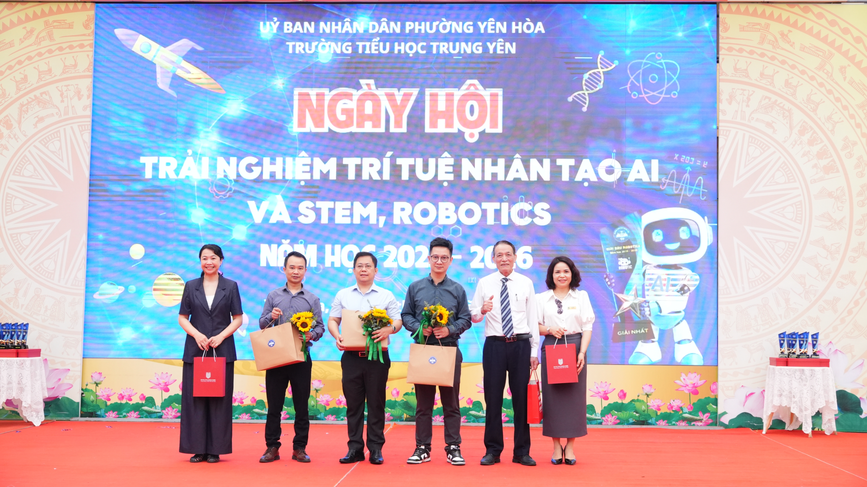 Trường Tiểu học Trung Yên tặng hoa tri ân các đơn vị đồng hành gồm Trung tâm Tiếng Anh Bình Minh, Trung tâm RoBohub và Công ty Cổ phần Công nghệ Foxcom Việt Nam đã hỗ trợ nhà trường triển khai các hoạt động STEM, Robotics và AI.