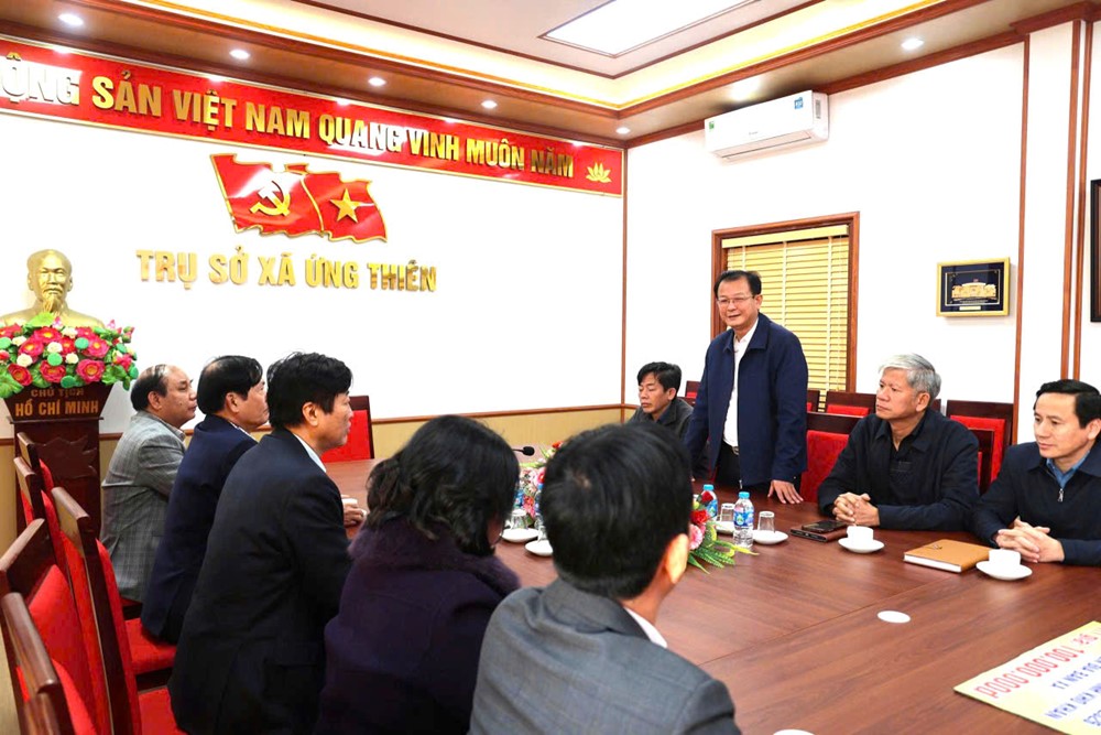 Phát biểu tại buổi làm việc, Bí thư Đảng ủy, Chủ tịch HĐND xã Ứng Thiên Nguyễn Chí Viễn thông tin khái quát về công tác an sinh xã hội của xã trong thời gian qua. Theo đó, năm 2025, địa phương đã tập trung thực hiện đồng bộ các chính sách an sinh xã hội, kịp thời chăm lo cho các đối tượng chính sách, hộ nghèo, hộ cận nghèo và các gia đình có hoàn cảnh khó khăn; tổ chức thăm hỏi, hỗ trợ Nhân dân nhân dịp lễ, Tết, góp phần ổn định đời sống, bảo đảm an sinh xã hội và trật tự an toàn trên địa bàn.