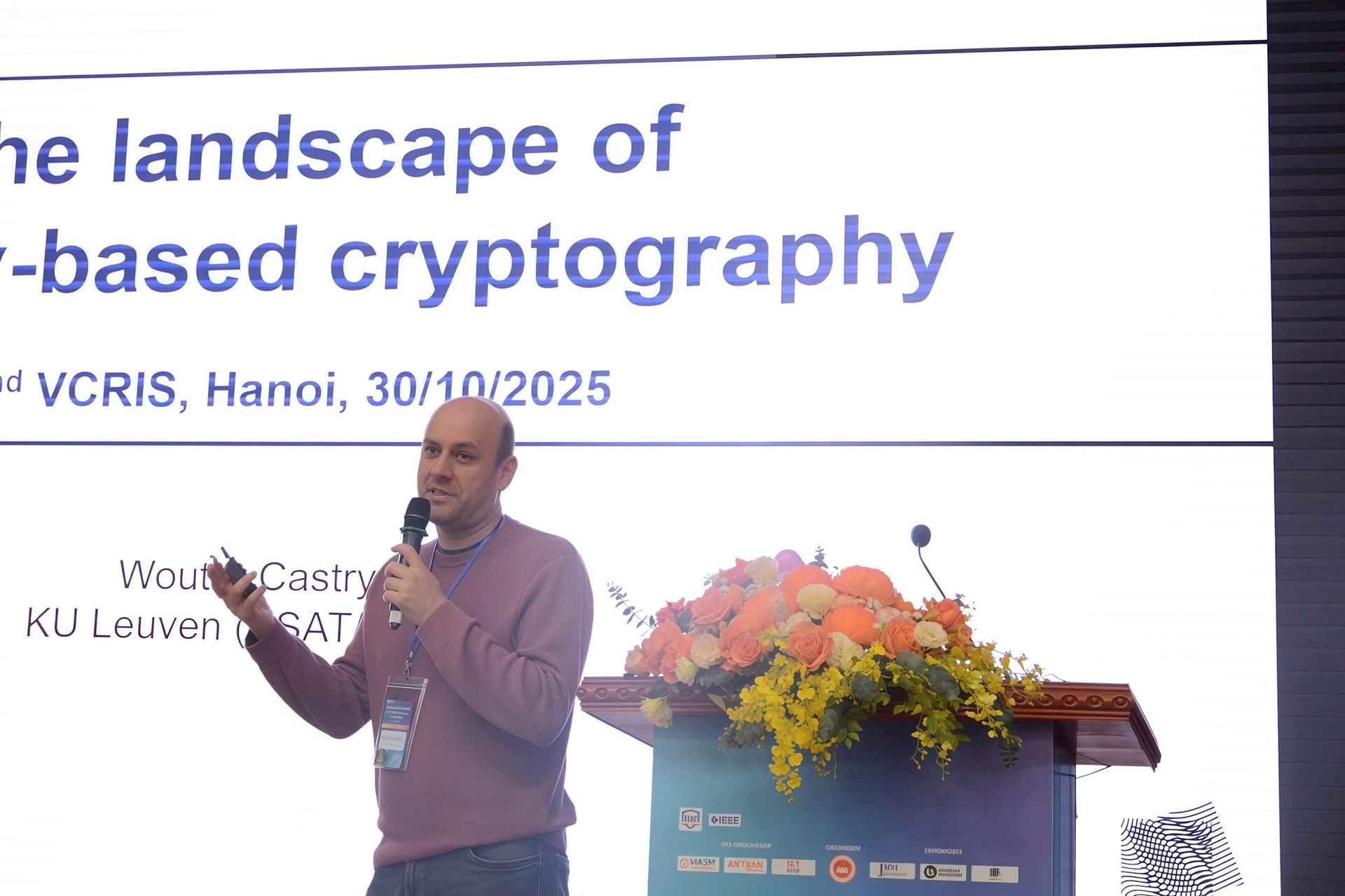TS. Wouter Castryck (Đại học KU Leuven, Bỉ) - một trong những chuyên gia hàng đầu thế giới về mật mã isogeny - trình bày tham luận “Isogeny-based Cryptography: An Overview of the Current Landscape”.
