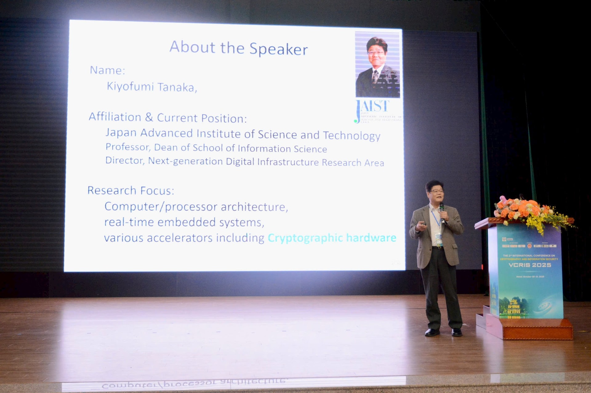 Trong đó, GS.TS Naoki Yonezawa (Nhật Bản) trình bày báo cáo về “Tăng tốc phần cứng mật mã trên nền tảng RISC-V cho hệ thống thời gian thực”, giới thiệu các giải pháp tối ưu hóa kiến trúc vi xử lý giúp tăng hiệu năng mã hóa mà không làm ảnh hưởng đến tốc độ xử lý, mở ra hướng đi mới trong việc thiết kế chip bảo mật dành cho các thiết bị IoT quy mô nhỏ.