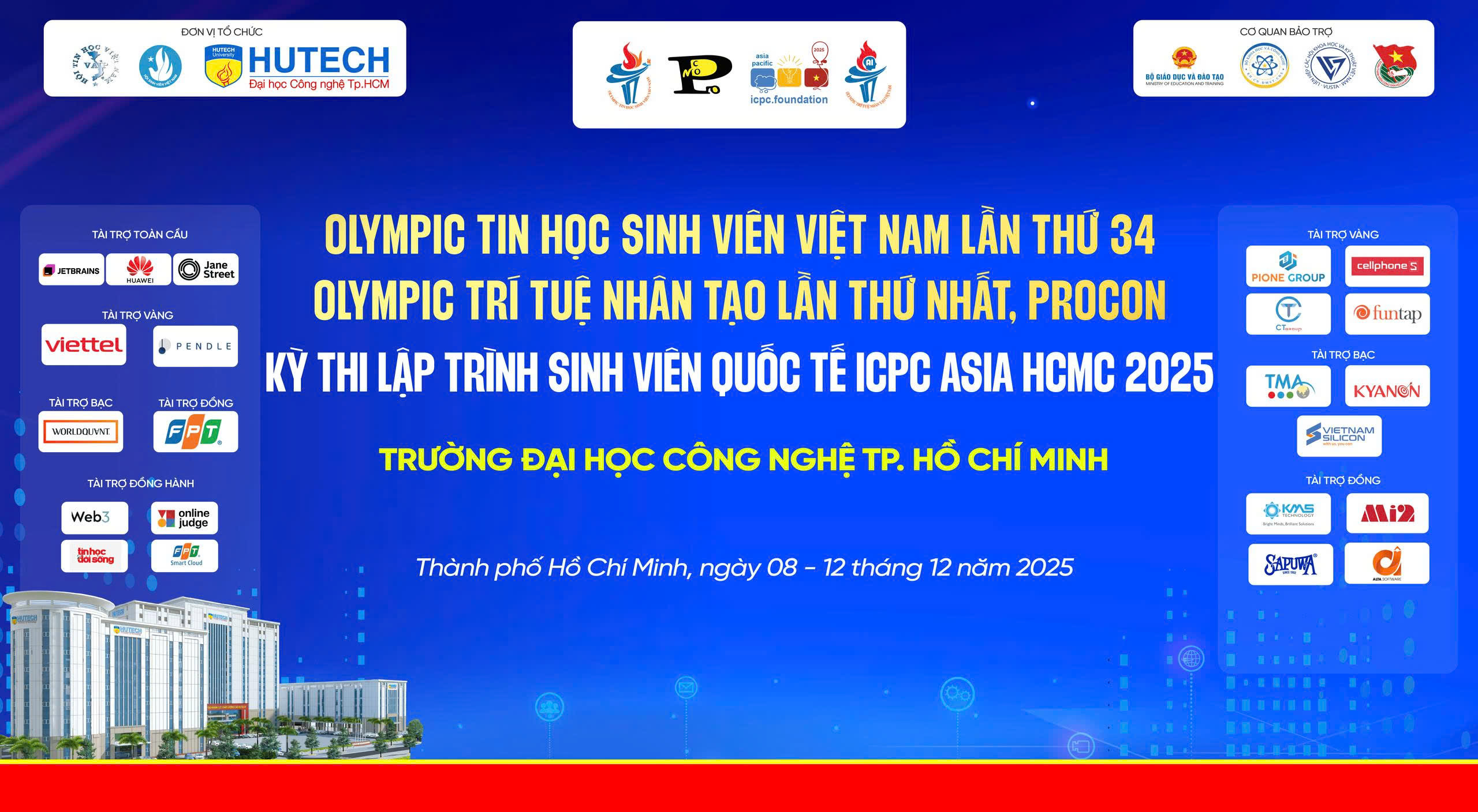 Sáng 10/12 tới, tại Trường Đại học Công nghệ TP.HCM (HUTECH) sẽ diễn ra lễ khai mạc Olympic Tin học Sinh viên Việt Nam lần thứ 34 (OLP’25), Olympic Trí tuệ nhân tạo Sinh viên Việt Nam lần thứ nhất, Procon Việt Nam và Kỳ thi Lập trình sinh viên quốc tế ICPC khu vực châu Á – Asia Ho Chi Minh City 2025. Sự kiện có sự tham dự của lãnh đạo Bộ Giáo dục Đào tạo, Bộ Khoa học và Công nghệ, Liên hiệp các Hội KH&KT Việt Nam, TW Đoàn TNCS Hồ Chí Minh, UBND Thành phố Tp Hồ Chí Minh cùng lãnh đạo nhiều trường Đại học và Cao đẳng cùng đại diện các Nhà tài trợ, các Doanh nghiệp CNTT-TT và đông đảo các cơ quan báo chí, truyền hình.