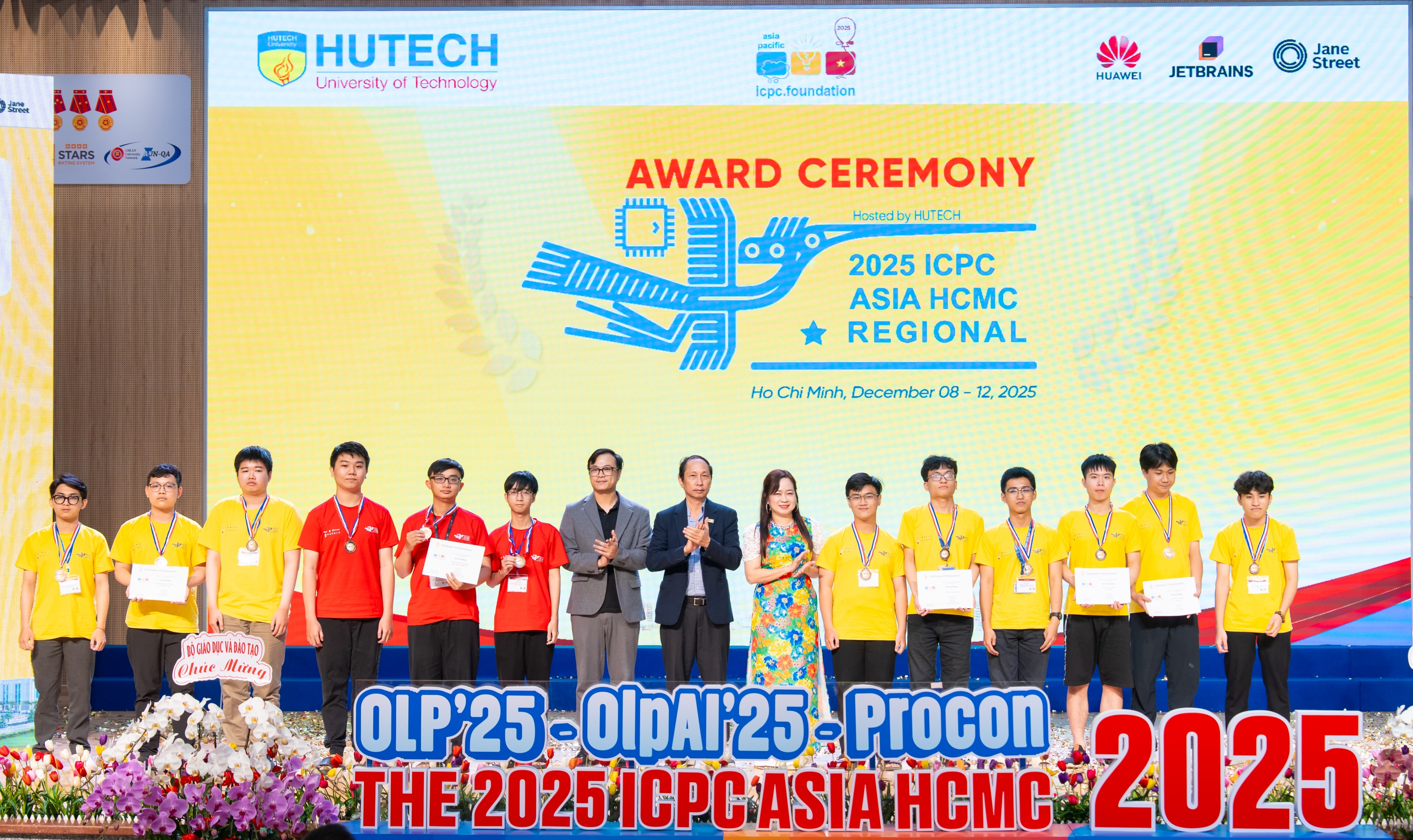 GS. TS. Nguyễn Thanh Thuỷ, Chủ tịch VAIP; TS. Lê Đình Lương, Giám đốc ICPC HCMC; ông Đỗ Đình Đắc, Giám đốc Công ty Pendle Chi nhánh Hà Nội và bà Luo Wei, đại diện Nhà trợ toàn cầu ICPC Tập đoàn Huawei trao huy chương Vàng ICPC Asia HoChiMinh City 2025.