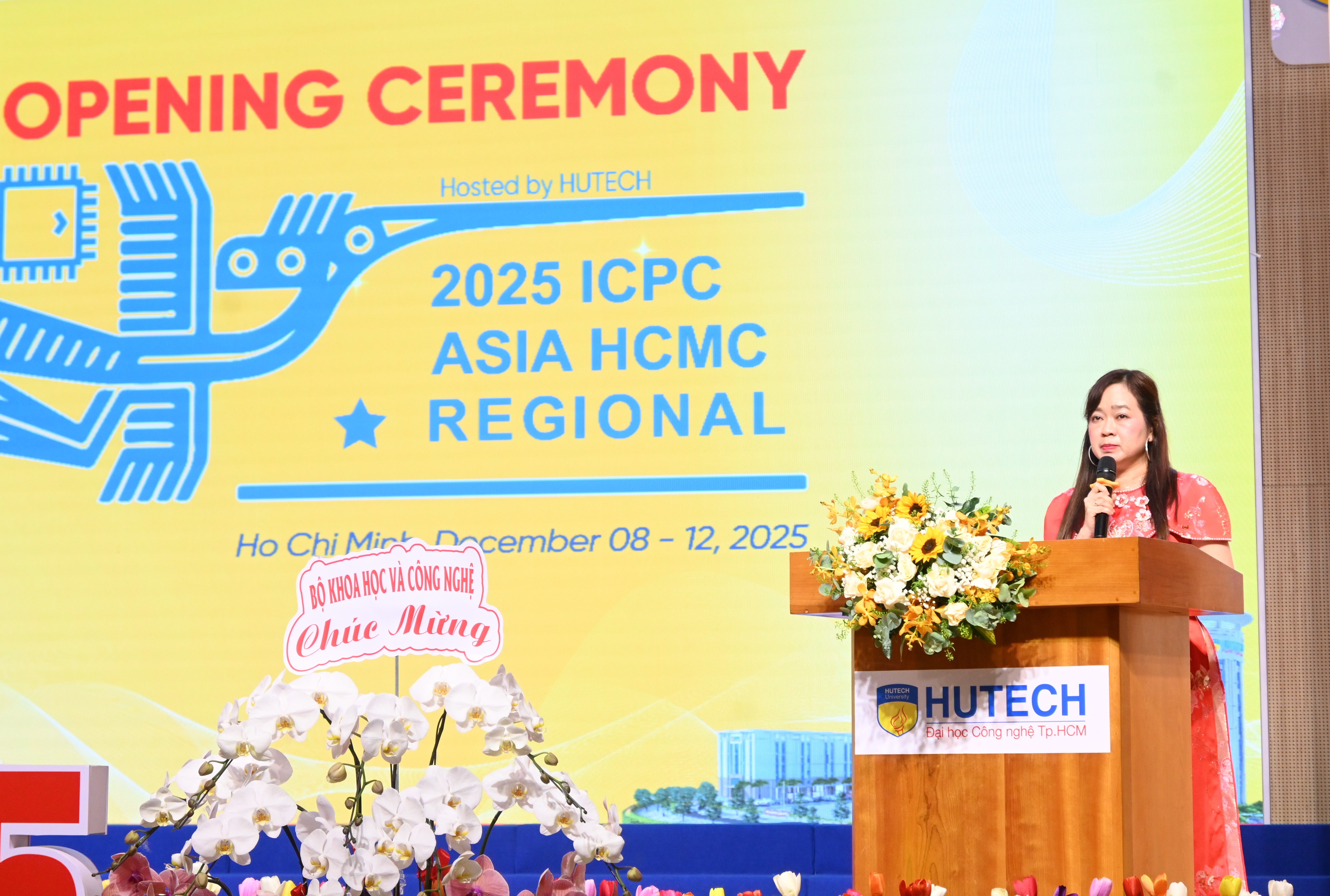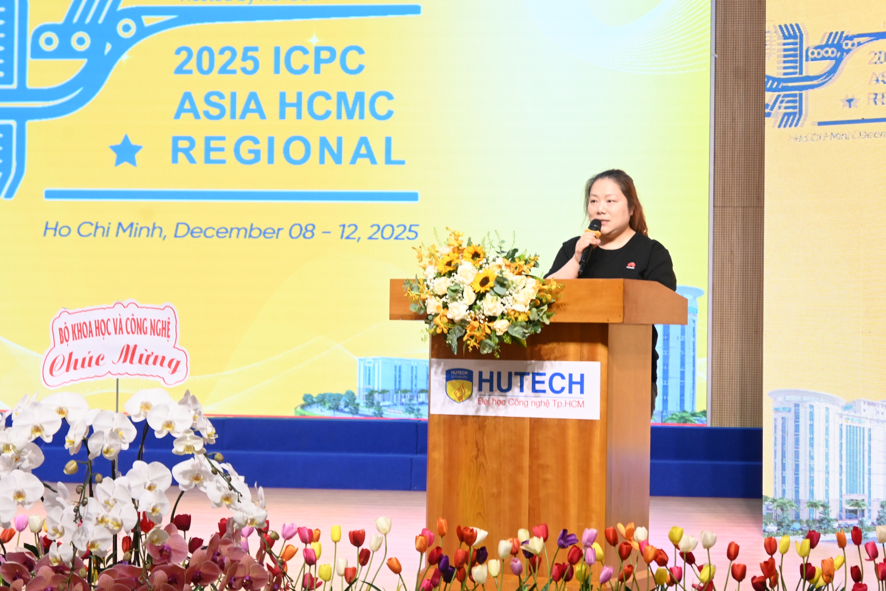 Phát biểu khai mạc, bà Lý Thiên Trang – Phó Hiệu trưởng HUTECH khẳng định ICPC đã trở thành biểu tượng của trí tuệ, tinh thần đồng đội và đổi mới sáng tạo: “Vòng thi khu vực Châu Á là sân chơi toàn cầu, nơi những bộ óc trẻ vận dụng tư duy thuật toán, tư duy tính toán và kỹ năng giải quyết vấn đề để vượt qua giới hạn của khoa học máy tính”.