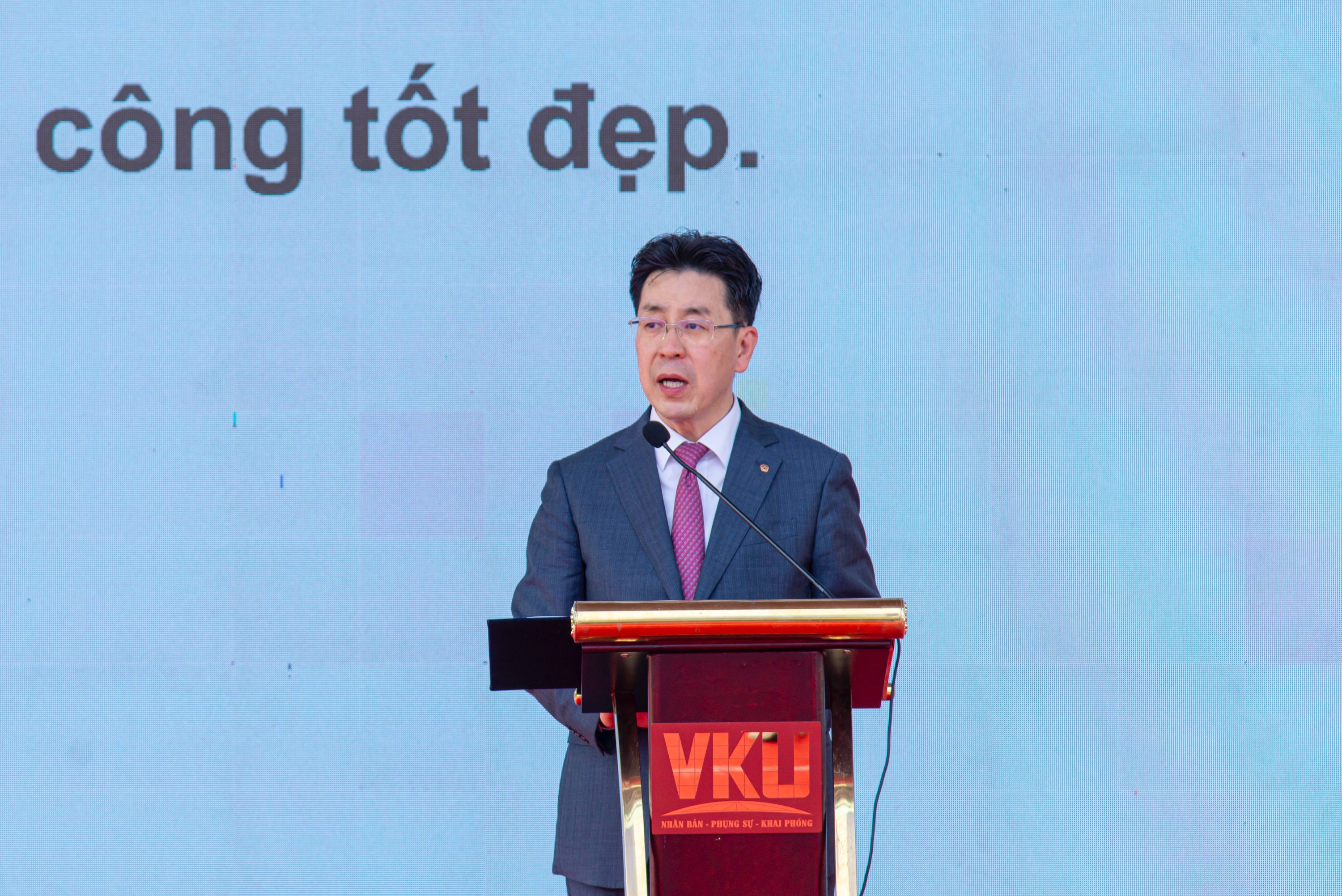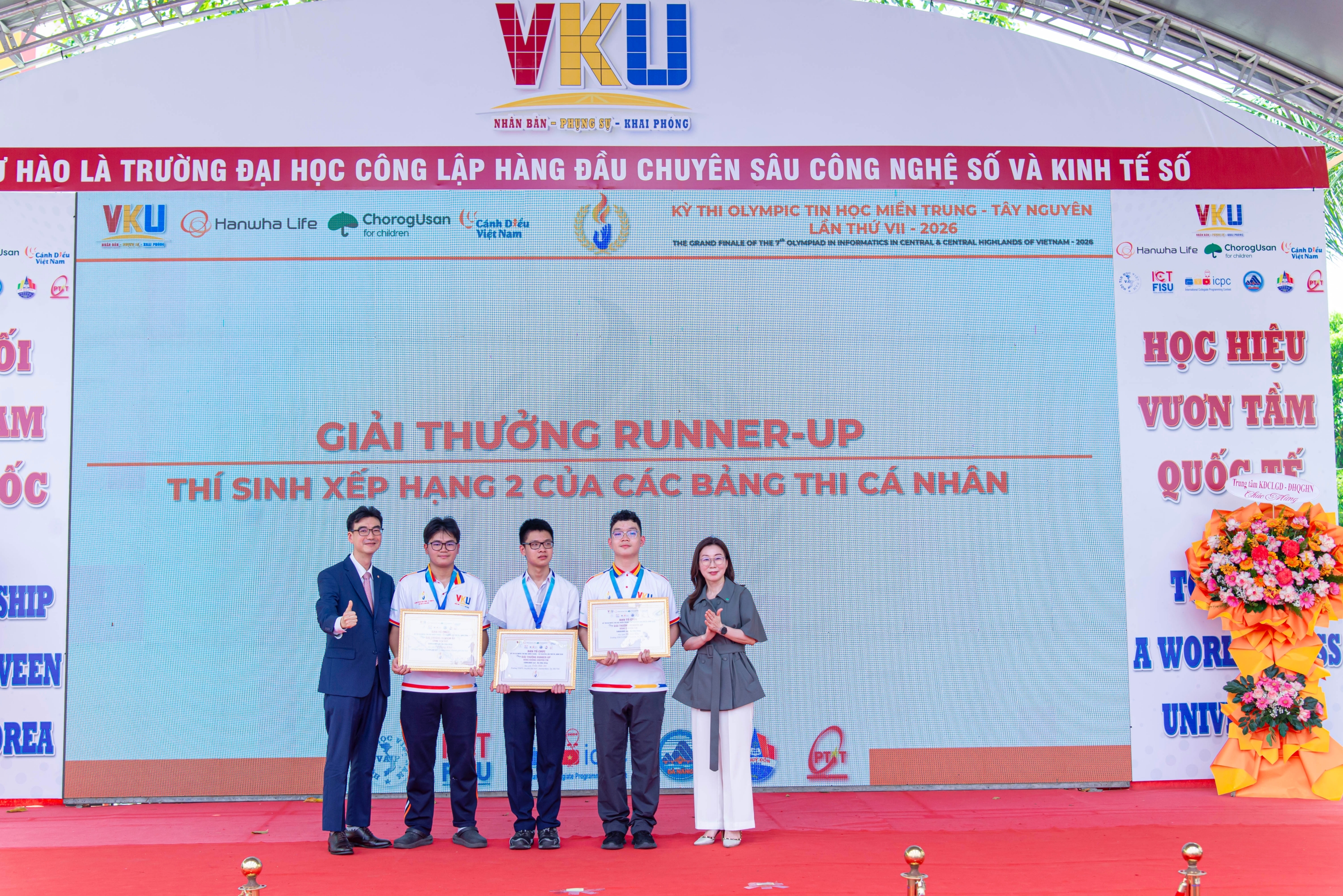 Đại diện đơn vị đồng hành, ông Lim Suk Hyun-Phó Tổng Giám đốc điều hành cấp cao Tập đoàn Hanwha Life, Hàn Quốc bày tỏ ấn tượng sâu sắc trước thành công của OLP Tin học MT-TN lần thứ VII, đồng thời đánh giá cao năng lực, tinh thần cầu tiến và ý chí vượt thử thách của các thí sinh. Những gì các em thể hiện không chỉ là kết quả của quá trình nỗ lực bền bỉ mà còn cho thấy tiềm năng trở thành lực lượng nòng cốt dẫn dắt kỷ nguyên số trong tương lai; đồng thời khẳng định hành trình tham gia cuộc thi chính là nền tảng quý báu cho sự phát triển lâu dài của mỗi thí sinh. Bên cạnh đó, ông ghi nhận và đánh giá cao vai trò của VKU trong việc tổ chức một sân chơi học thuật chất lượng, mang ý nghĩa như một môi trường ươm mầm và phát triển nhân tài công nghệ, góp phần mở rộng nguồn nhân lực số cho Việt Nam. Trước xu thế chuyển đổi số mạnh mẽ, ông khẳng định Hanwha Life sẽ tiếp tục đồng hành không chỉ với vai trò tài trợ mà còn hướng đến tạo dựng các cơ hội phát triển thực chất, góp phần xây dựng hệ sinh thái bồi dưỡng nhân tài bền vững trong tương lai.
