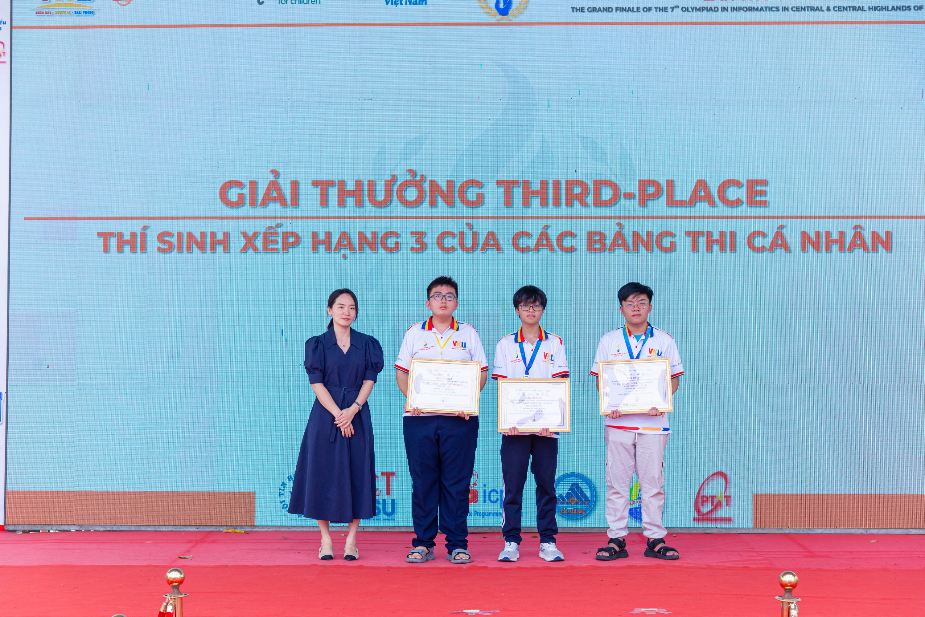 + Giải thưởng Championship: Học sinh có thứ hạng cao nhất của mỗi bảng (03 giải cho 3 Bảng): Cúp và tiền thưởng 5.000.000 đồng/01 giải gồm: Hoàng Hải Minh- Trường THPT Triệu Sơn 5, Thanh Hóa (Bảng Không Chuyên Tin); Phạm Đại Nam-Trường THPT Chuyên Nguyễn Tất Thành, Quảng Ngãi (Bảng Chuyên Tin) và Đặng Huy Hậu-Trường THPT Chuyên Thăng Long, Lâm Đồng (Bảng Siêu cup)