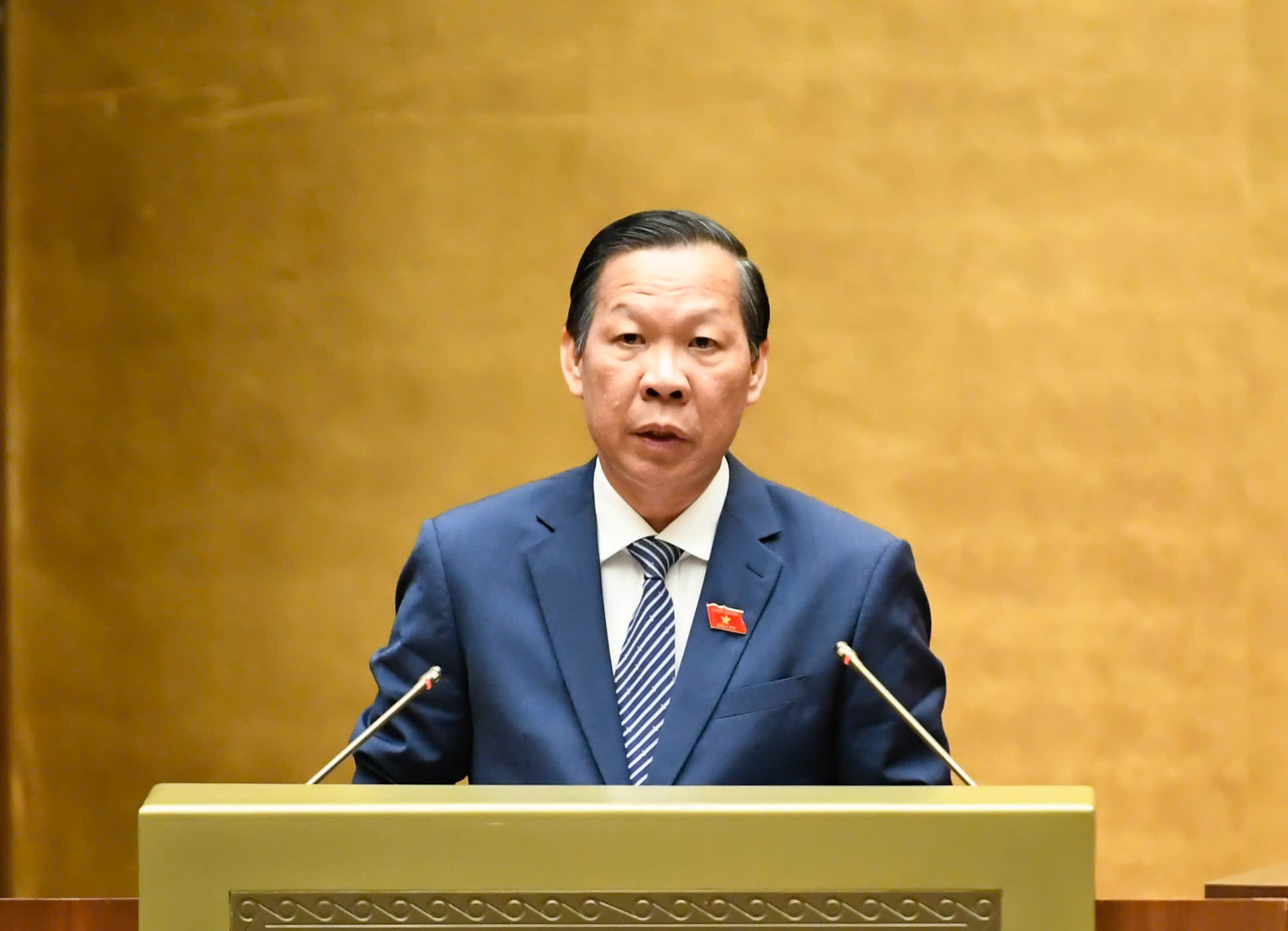 Chủ nhiệm Ủy ban Kinh tế và Tài chính của Quốc hội Phan Văn Mãi báo cáo thẩm tra về đánh giá bổ sung kết quả thực hiện kế hoạch phát triển kinh tế - xã hội và ngân sách nhà nước - Ảnh: VGP/Nhật Bắc