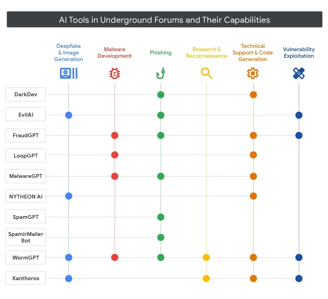 Trong số các công cụ nổi bật được quảng bá trên các diễn đàn, WormGPT, FraudGPT, Evil-GPT, Xanthorox AI và NYTHEON AI là những cái tên được nhắc đến nhiều nhất.
